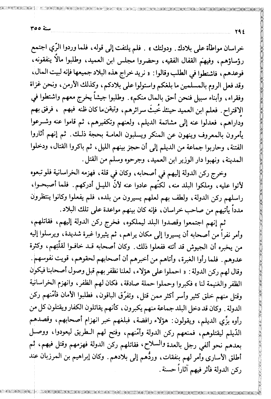 خراسان مواطأة على بلادك ودولتك فلم يلتفت إلى قوله فلما وردوا الري اجتمع رؤساؤهم وفيهم القفال الفقيه وحضروا مجلس ابن العميد وطلبوا مالا ينفقونه فوعدهم فاشتطوا في الطلب وقالوا نريد خراج هذه البلد جميعها فإنه لبيت المال وقد فعل الروم بالمسلمين ما بلغكم واستولوا على بلادكم وكذلك الأمن ونحن غزاة وفقراء وأبناء سبيل فنحن أحق بالمال منكم وطلبوا جيشا يخرج معهم واشتطوا في الاقتراح فعلم ابن العميد حيننئذ خبث سرائرهم وتيقن ما كان ظنه فيهم فرفق بهم وداراهم فعدلوا عنه إلى مشاتمة الديلم ولعنهم وتكفيرهم ثم قاموا عنه وشرعوا يأمرون بالمعروف وينهون عن المنكر ويسلبون العامة بحجة ذلك ثم إنهم أثاروا الفتنة وحاربوا جماعة من الديلم إلى أن حجز بينهم الليل ثم باكروا القتال ودخلوا المدينة ونهبوا دار الوزير ابن العميد وجرحوه وسلم من القتل