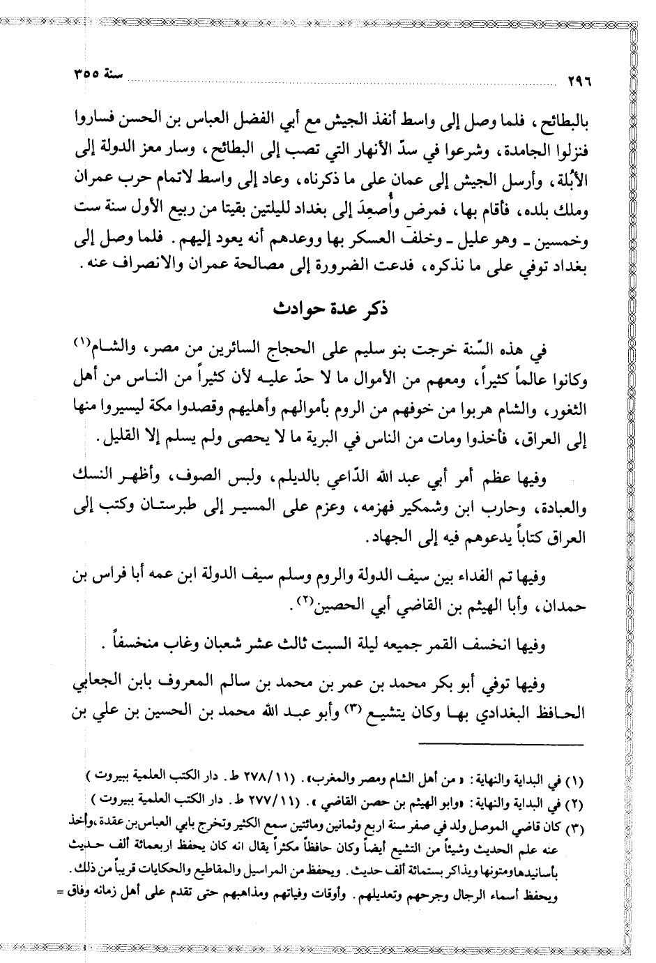 وفيها توفي أبو بكر محمد بن عمر بن محمد بن سالم المعروف بابن الجعابي الحافظ البغدادي بها وكان يتشيع وأبو عبد الله محمد بن الحسين بن علي بن