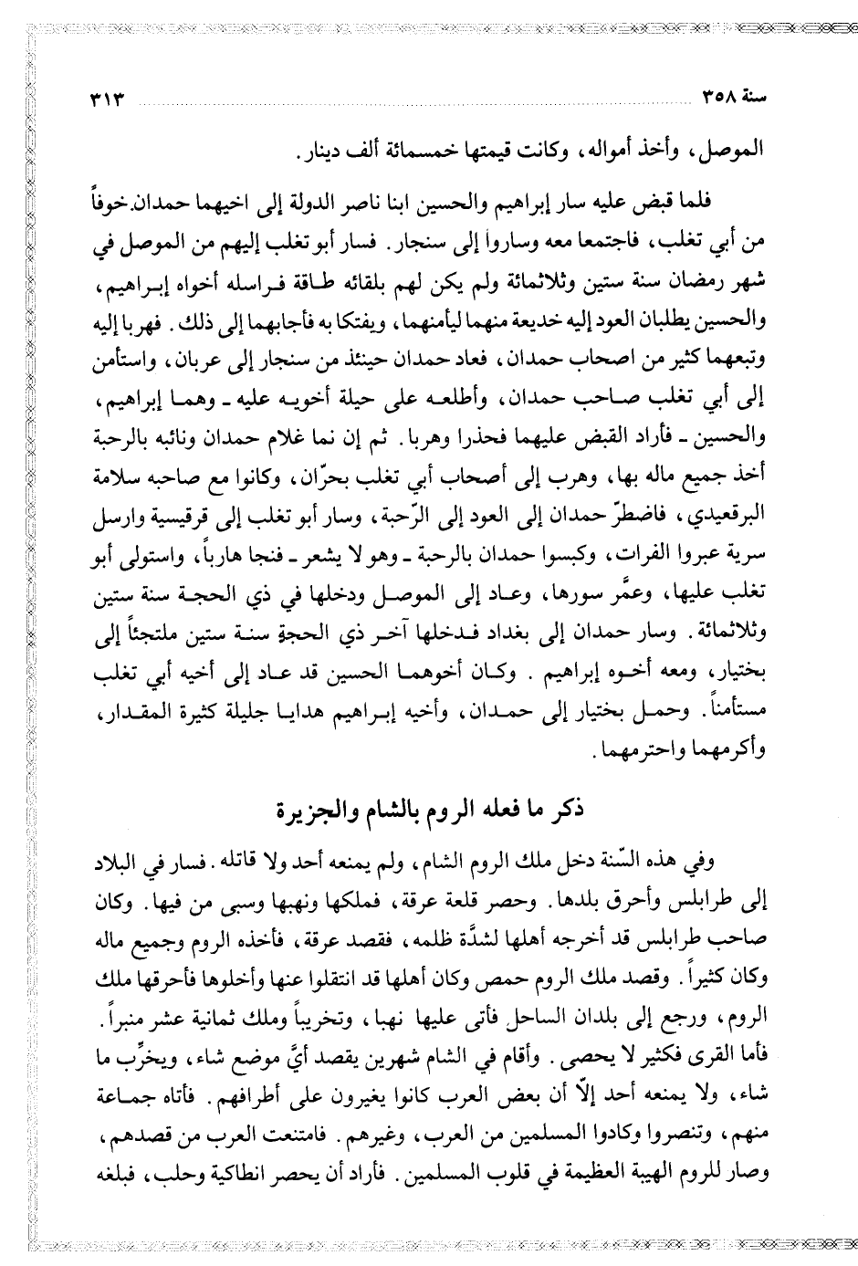 فلما قبض عليه سار إبراهيم والحسين ابنا ناصر الدولة إلى اخيهما حمدان خوفا من أبي تغلب فاجتمعا معه وساروا إلى سنجار فسار أبو تغلب إليهم من الموصل في شهر رمضان سنة ستين وثلاثمائة ولم يكن لهم بلقائه طاقة فراسله أخواه إبراهيم والحسين يطلبان العود إليه خديعة منهما ليأمنهما ويفتكا به فأجابهما إلى ذلك فهربا إليه وتبعهما كثير من أصحاب حمدان فعاد حمدان حيننئذ من سنجار إلى عربان واستأمن إلى أبي تغلب صاحب حمدان وأطلعه على حيلة أخويه عليه وهما إبراهيم والحسين فأراد القبض عليهما فحذرا وهربا ثم إن نما غلام حمدان ونائبه بالرحبة أخذ جميع ماله بها وهرب إلى أصحاب أبي تغلب بحران وكانوا مع صاحبه سلامة البرقعيدي فاضطر حمدان إلى العود إلى الرحبة وسار أبو تغلب إلى قرقيسية وارسل سرية عبروا الفرات وكبسوا حمدان بالرحبة وهو لا يشعر فنجا هاربا واستولى أبو تغلب عليها وعمر سورها وعاد إلى الموصل ودخلها اخر ذي الحجة سنة ستين وثلاثمائة وسار حمدان إلى بغداد فدخلها آخر ذي الحجة سنة ستين ملتجئا إلى بختيار ومعه أخوه إبراهيم وكان أخوهما الحسين قد عاد إلى أخيه أبي تغلب مستأمنا وحمل بختيار إلى حمدان وأخيه إبراهيم هدايا جليلة كثيرة المقدار وأكرمهما واحترمهما