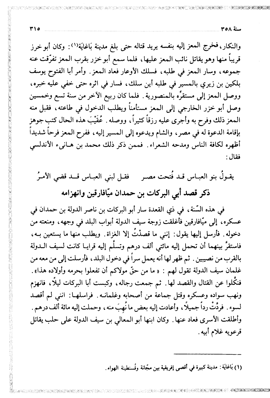 في هذه السنة في ذي القعدة سار أبو البركات بن ناصر الدولة بن حمدان في عسكره إلى ميافارقين فأغلقت زوجة سيف الدولة أبواب البلد في وجهه ومنعته من دخوله فأرسل إليها يقول إنني ما قصدت إلا الغزاة ويطلب منها ما يستعين به فاستقر بينهما أن تحمل إليه مائتي ألف درهم وتسلم إليه قرايا كانت لسيف الدولة بالقرب من نصيبين ثثن ظهر لها أنه يعمل سرا في دخول البلد فأرسلت إلى من معه من غلمان سيف الدولة تقول لهم ما من حق مولاكم أن تفعلوا بحرمة وأولاده هذا فنكلوا عن القتال والقصد لها ثم جمعت رجال وكبست أبا البركات ليلا فانهزم ونهب سواده وعسكره وقتل جماعة من أصحابه وغلمانه فراسلها انني لم اقصد لسوء فردت ردا جميلا وأعادت إليه بعض ما نهب منه وحملت إليه مائة ألف درهم وأطلقت الأسرى فعاد عنها وكان ابنها أبو المعالي بن سيف الدولة على حلب يقاتل قرعويه غلام أبيه