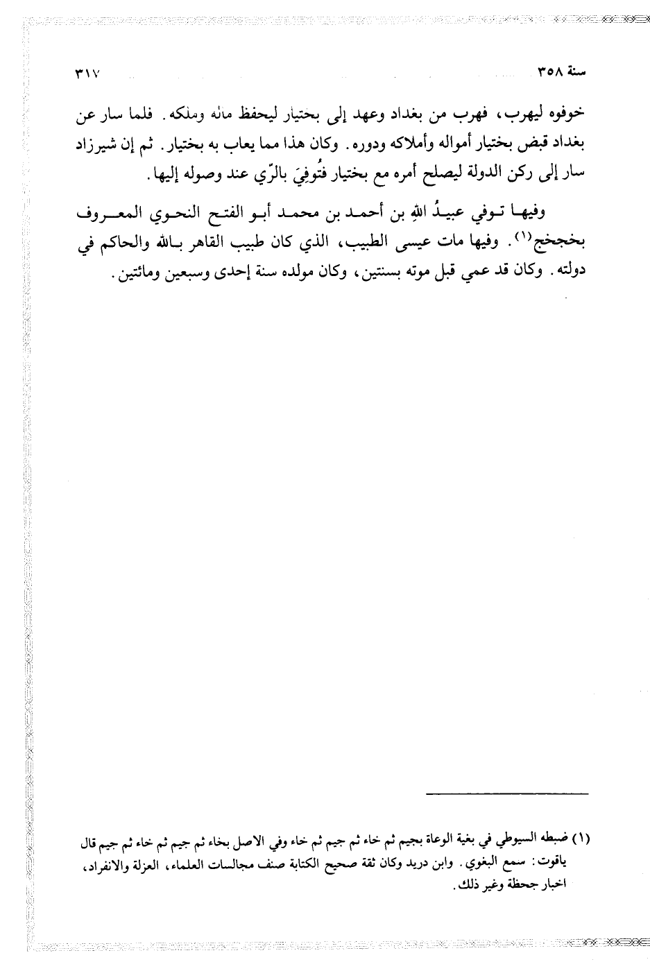 وفيها توفي عبيد الله بن أحمد بن محمد أبو الفتح النحوي المعروف بخجخج وفيها مات عيسى الطبيب الذي كان طبيب القاهر بالله والحاكم في دولته وكان قد عمي قبل موته بسنتين وكان مولده سنة إحدى وسبعين ومائتين