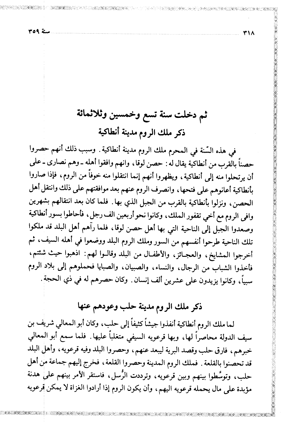 في هذه السنة في المحرم ملك الروم مدينة أنطاكية وسبب ذلك أنهم حصروا حصنا بالقرب من أنطاكية يقال له حصن لوقا وانهم وافقوا أهله وهم نصارى على أن يرتحلوا منه إلى أنطاكية أعانوهم على فتحها وانصرف الروم عنهم بعد موافقتهم على ذلك وانتقل أهل الحصن ونزلوا بانطاكية بالقرب من الجبل الذي بها فلما كان بعد انتقالهم بشهرين وافى الروم مع أخي تقفور الملك وكانوا نحوا أربعين ألف رجل فأحاطوا بسور أنطاكية وصعدوا الجبل إلى الناحية التي بها أهل حصن لوقا فلما رآهم أهل البلد قد ملكوا تلك الناحية طرحوا أنفسهم من السور وملك الروم البلد ووضعوا في أهله السيف ثم اخرجوا المشايخ والعجائز والأطفال من البلد وقالوا لهم اذهبوا حيث شئتم فأخذوا الشباب من الرجال والنساء والصبيان والصبايا فحملوهم إلى بلاد الروم سبيا وكانوا يزيدون على عشرين ألف إنسان وكان حصرهم له في ذي الحجة