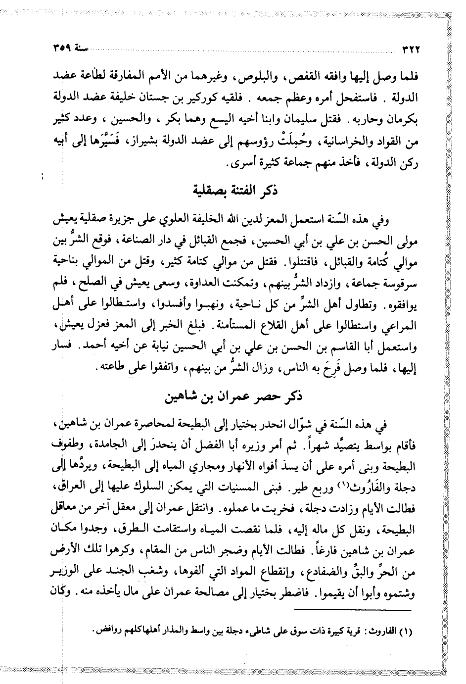 في هذه السنة في شوال انحدر بختيار إلى البطيحة لمحاصرة عمران بن شاهين فأقام بواسط يتصيد شهرا ثم أمر وزيره أبا الفضل أن ينحدر إلى الجامدة وطفوف البطيحة وبنى أمره على أن يسد أفواه الانهار ومجاري المياه إلى البطيحة ويردها إلى دجلة والفاروث وربع طير فبنى المسنيات التي يمكن السلوك عليها إلى العراق فطالت الأيام وزادت دجلة فخربت ما عملوه وانتقل عمران إلى معقل آخر من معاقل البطيحة ونقل كل ماله إليه فلما نقصت المياه واستقامت الطرق وجدوا مكان عمران بن شاهين فارغا فطالت الأيام وضجر الناس من المقام وكرهوا تلك الأرض من الحر والبق والضفادع وإنقطاع المواد التي ألفوها وشغب الجند على الوزير وشتموه وأبوا أن يقيموا فاضطر بختيار إلى مصالحة عمران على مال يأخذه منه وكان
