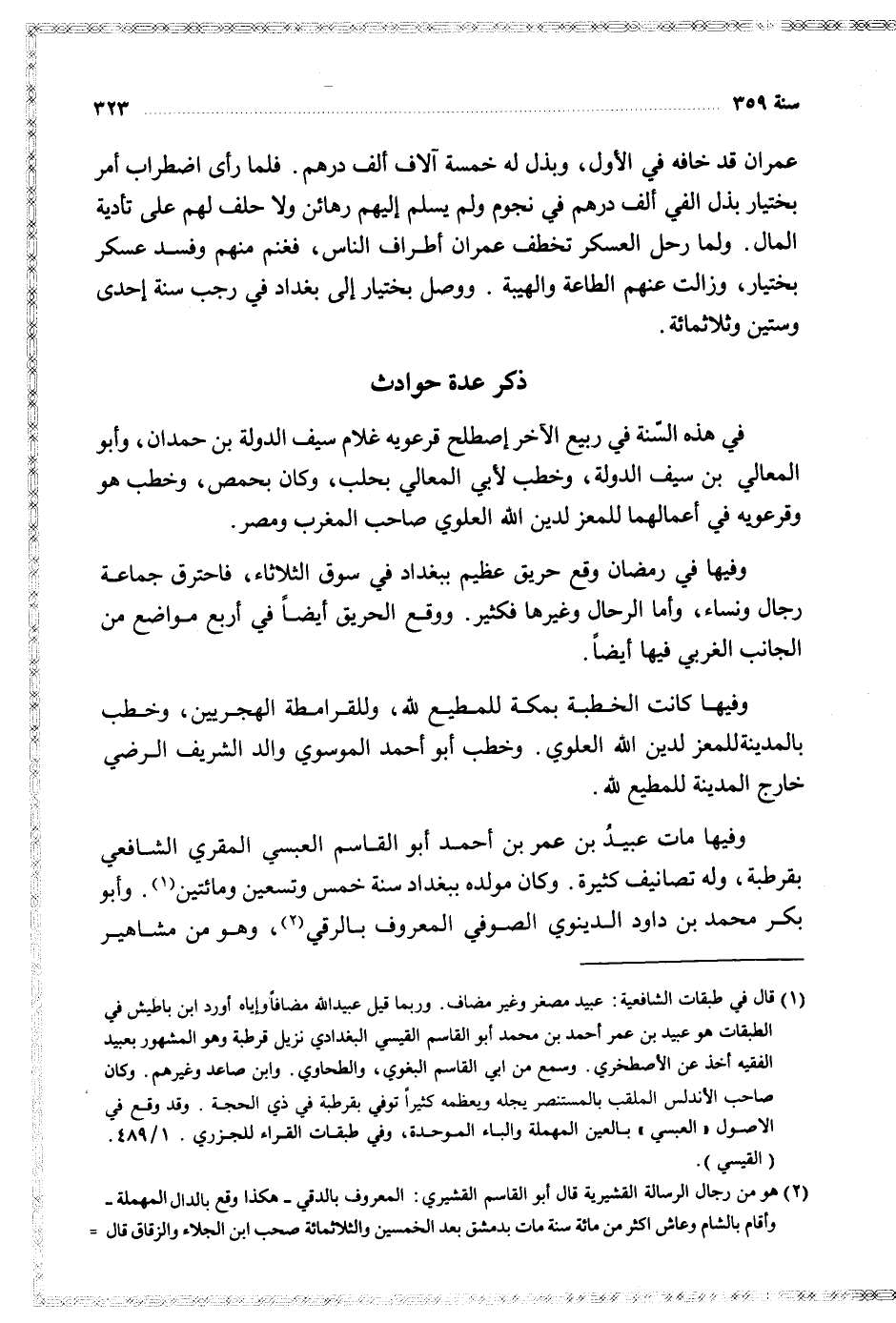 وفيها مات عبيد بن عمر بن أحمد أبو القاسم العبسي المقري الشافعي بقرطبة وله تصانيف كثيرة وكان مولده ببغداد سنة خمس وتسعين ومائتين وأبو بكر محمد بن داود الدنيوي الصوفي المعروف بالرقي وهو من مشاهير