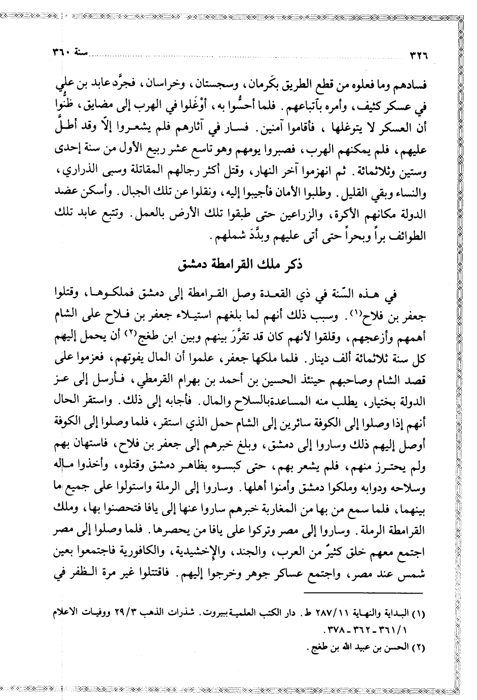 في هذه السنة في ذي القعدة وصل القرامطة إلى دمشق فملكوها وقتلوا جعفر بن فلاح وسبب ذلك أنهم لما بلغهم استيلاء جعفر بن فلاح على الشام أهمهم وأزعجهم وقلقوا لأنهم كان قد تقرر بينهم وبين ابن طغج أن يحمل إليهم كل سنة ثلاثمائة ألف دينار فلما ملكها جعفر علموا أن المال بفوتهم فعزموا على قصد الشام وصاحبهم حيننئذ الحسين بن أحمد بن بهرام القرمطي فأرسل إلى عز الدولة بختيار يطلب من المساعدة بالسلاح والمال فأجابه إلى ذلك واستقر الحال أنهم إذا وصلوا إلى الكوفة سائرين إلى الشام حمل الذي استقر فلما وصلوا إلى الكوفة أوصل إليهم ذلك وساروا إلى دمشق وبلغ خبرهم إلى جعفر بن فلاح فاستهان بهم ولم يحترز منهم فلم يشعر بهم حتى كبسوه بظاهر دمشق وقتلوه وأخذوا ماله وسلاحه ودوابه وملكوا دمشق وأمنوا أهلها وساروا إلى الرملة واستولوا على جميع ما بينهما فلما سمع من بها من المغاربة خبرهم ساروا عنها إلى يافا فتحصنوا بها وملك القرامطة الرملة وساروا إلى مصر وتركوا على يافا من يحصرها فلما وصلوا إلى مصر اجتمع معهم خلق كثير من العرب والجند والإخشيدية والكافورية فاجتمعوا بعين شمس عند مصر واجتمع عساكر جوهر وخرجوا إليهم فاقتتلوا غير مرة الظفر في