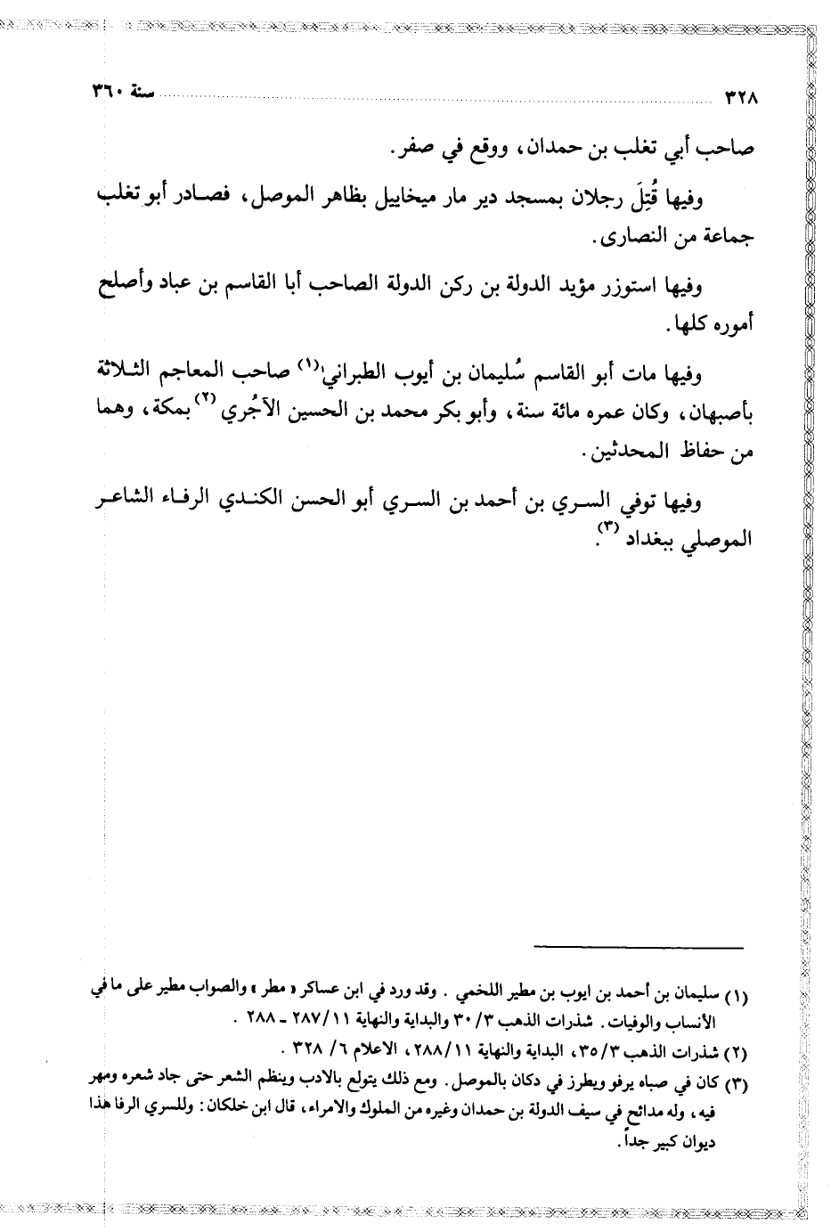 وفيها مات أبو القاسم سليمان بن أيوب الطبراني صاحب المعاجم الثلاثة بأصبهان وكان عمره مائة سنة وأبو بكر محمد بن الحسين الآجري بمكة وهما من حفاظ المحدثين