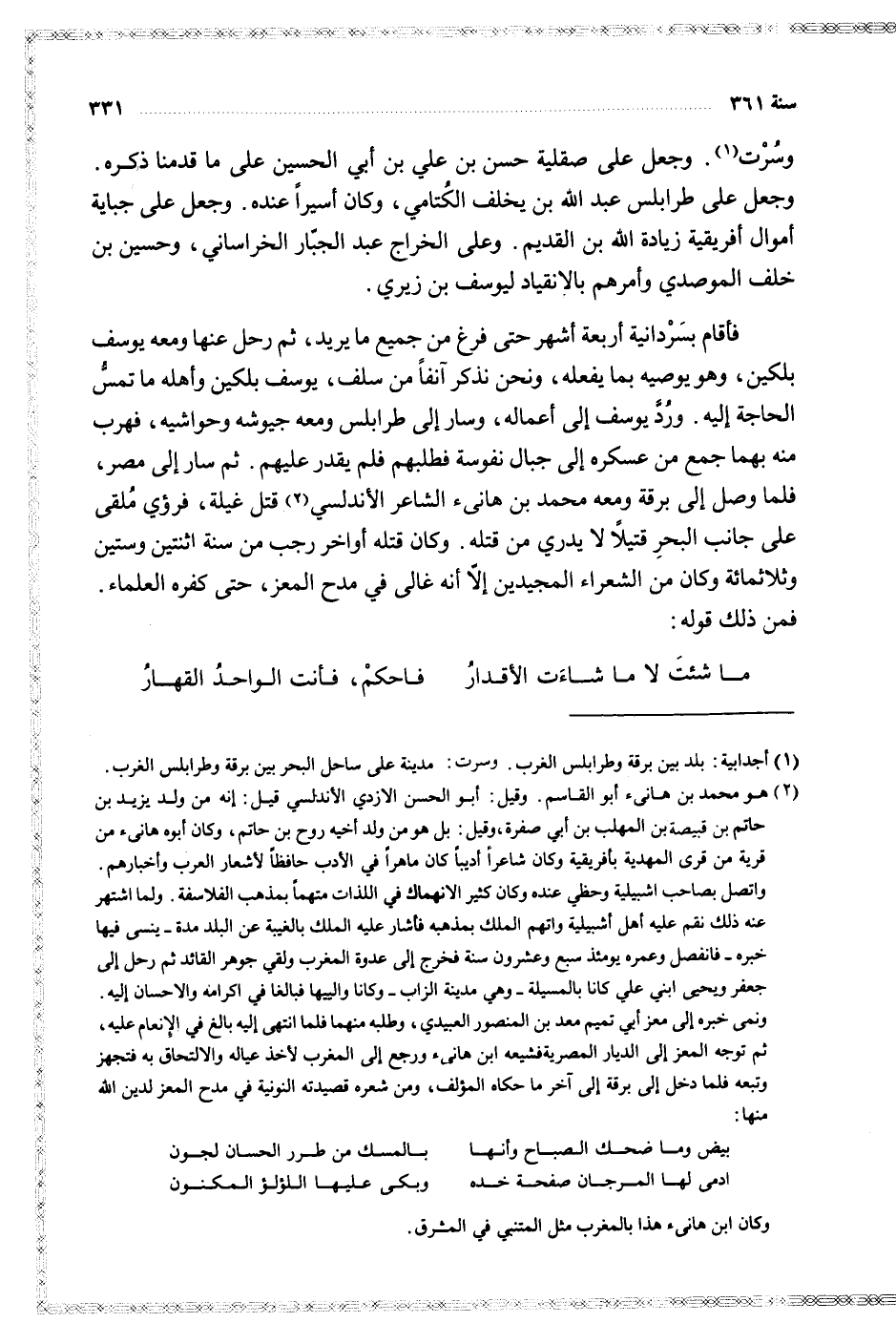 فأقام بسردانية أربعة أشهر حتى فرغ من جميع ما يريد ثم رحل عنها ومعه يوسف بلكين وهو يوصيه بما يفعله ونحن نذكر آنفا من سلف يوسف بلكين وأهله ما تمس الحاجة إليه ورد يوسف إلى أعماله وسار إلى طرابلس ومعه جيوشه وحواشيه فهرب منه بهما جمع من عسكره إلى جبال نفوسة فطلبهم فلم يقدر عليهم ثم سار إلى مصر فلما وصل إلى برقة ومعه محمد بن هانئ الشاعر الأندلسي قتل غيلة فرؤي ملقى على جانب البحر قتيلا لا يدري من قتله وكان قتله أواخر رجب من سنة اثنتين وستين وثلاثمائة وكان من الشعراء المجيدين إلا أنه غإلى في مدح المعز حتى كفره العلماء فمن ذلك قوله