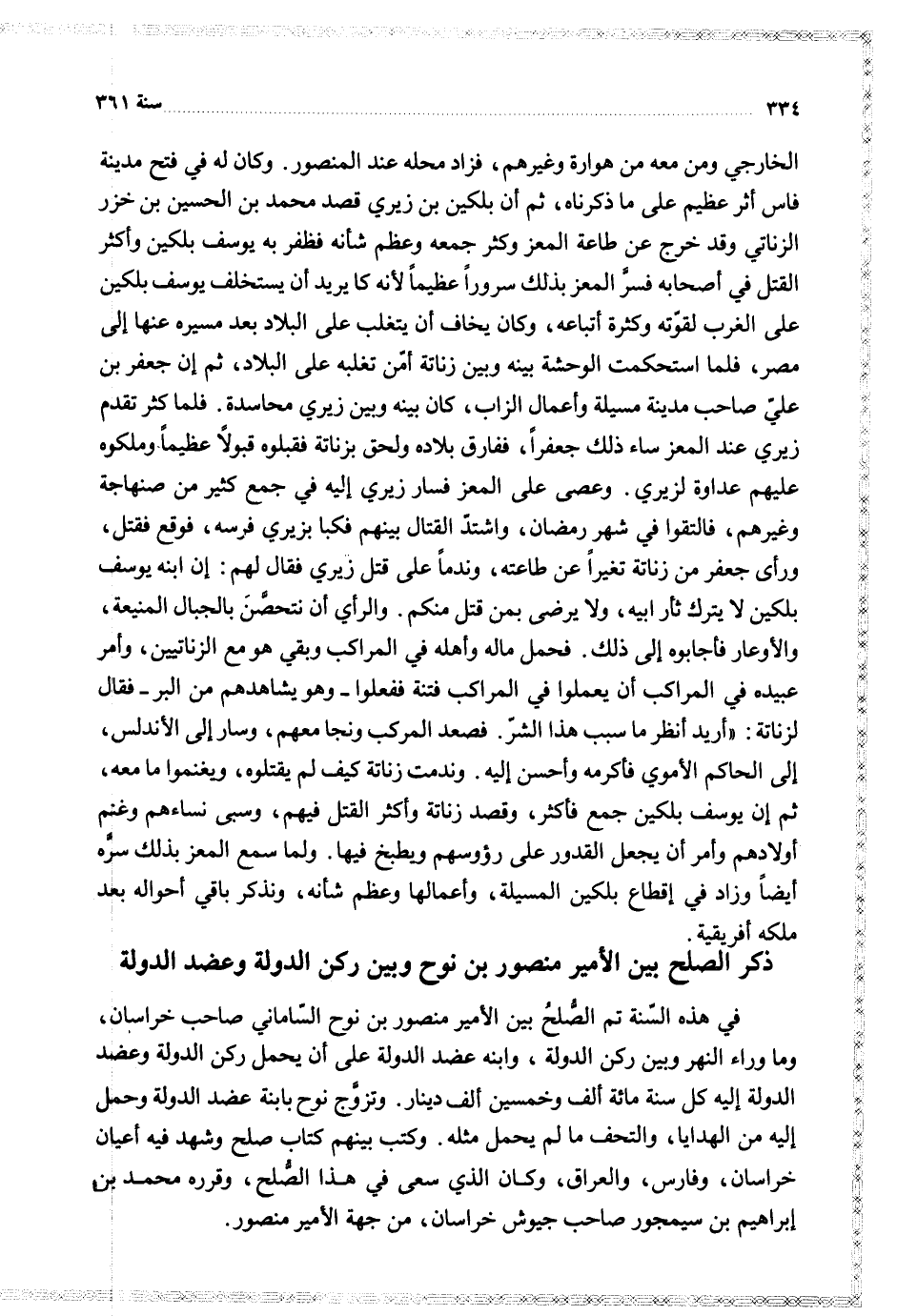 في هذه السنة تم الصلح بين الأمير منصور بن نوح الساماني صحاب خراسان وما وراء النهر وبين ركن الدولة وابنه عضد الدولة على أن يحمل ركن الدولة وعضد الدولة إليه كل سنة مائة ألف وخمسين ألف دينار وتزوج نوح بابنة عضد الدولة وحمل إليه من الهدايا والتحف ما لم يحمل مثله وكتب بينهم كتاب صلح وشهد فيه أعيان خراسان وفارس والعراق وكان الذي سعى في هذا الصلح وقرره محمد بن إبراهيم بن سيمجور صاحب جيوش خراسان من جهة الأير منصور