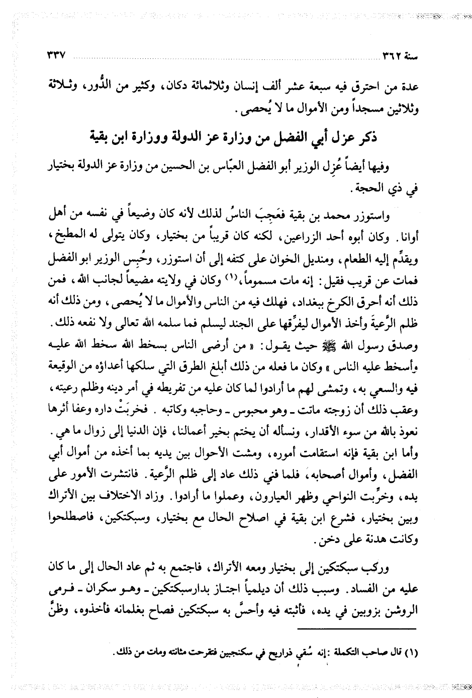 وفيها أيضا عزل الوزير أبو الفضل العباس بن الحسين من وزارة عز الدولة بختيار في ذي الحجة