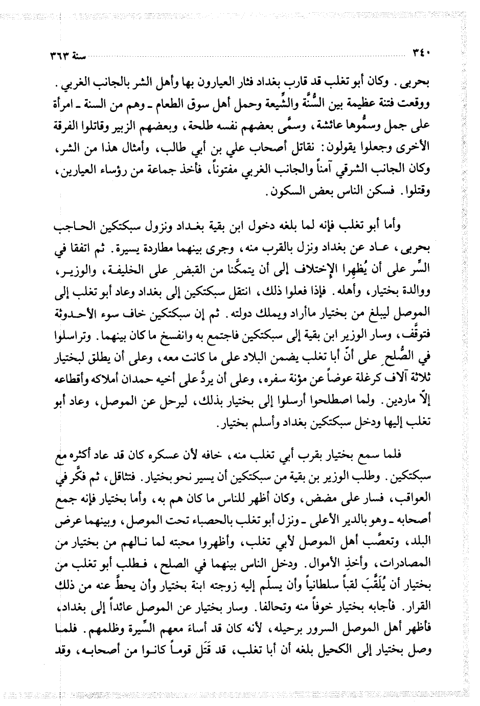 بحربى وكان أبو تغلب قد قارب بغداد فثار العيارون بها وأهل الشر بالجانب الغربي ووقعت فتنة عظيمة بين السنة والشيعة وحمل أهل سوق الطعام وهم من السنة أمرا على جمل وسموها عائشة وسمى بعضهم نفسه طلحة وبعضهم الزبير وقاتلوا الفرقا الأخرى وجعلوا يقولون نقاتل أصحاب علي بن أبي طالب وأمثال هذا من الشر وكان الجانب الشرقي آمنا والجانب الغربي مفتونا فأخذ جماعة من رؤساء العيارين وقتلوا فسكن الناس بعض السكون