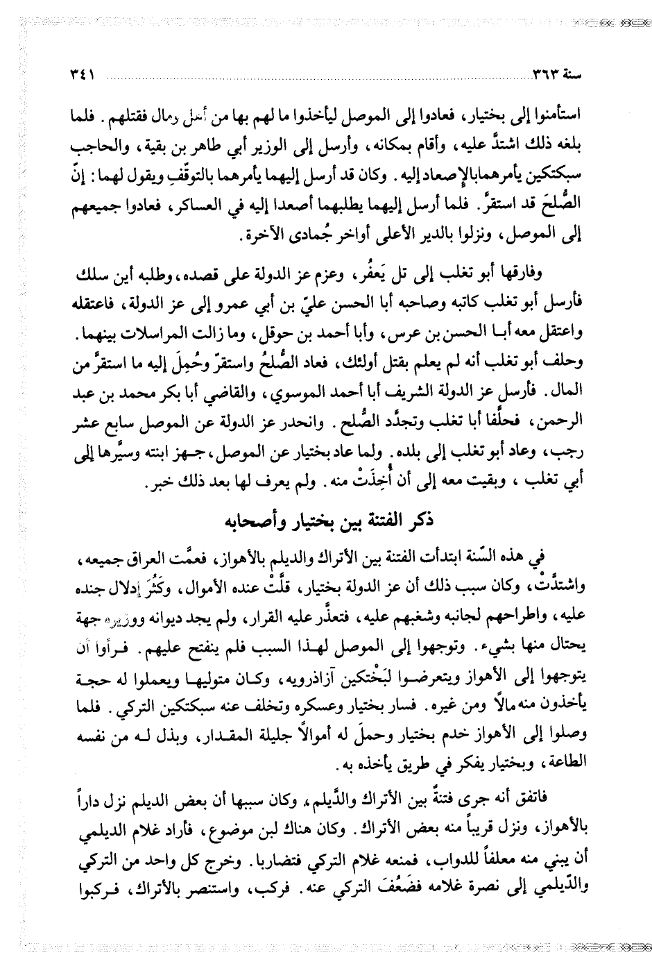 في هذه السنة ابتدأت الفتنة بين الأتراك والديلم بالأهواز فعمت العراق جميعه واشتدت وكان سبب ذلك أن عز الدولة بختيار قلت عنده الأموال وكثر إدلال جنده عليه واطراحهم لجانبه وشغبهم عليه فتعذر عليه القرار ولم يجد ديوانه ووزيره جهة يحتال منها بشيء وتوجهوا إلى الموصل لهذا السبب فلم ينفتح عليهم فرأوا أن يتوجهوا إلى الأهواز ويتعرضوا لبختكين آزادرويه وكان متوليها وعملوا له حجة يأخدون منه مالا ومن غيره فسار يختيار وعسكره وتخلف عنه سبكتكين التركي فلما وصلوا إلى الأهواز خدم بختيار وحمل له أموالا جليلة المقدار وبذل له من نفسه الطاعة وبختيار يفكر في طريق يأخذه به