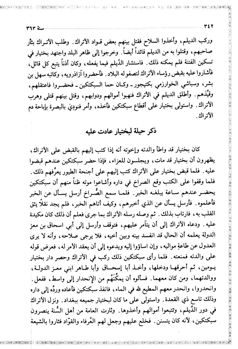 وركب الديلم وأخذوا السلاح فقتل بينهم بعض قواد الأتراك وطلب الأتراك بثأر صاحبهم وقتلوا به من الديلم قائدا أيضا وخرجوا إلى ظاهر البلد واجتهد بختيار في تسكين الفتنة فلم يمكنه ذلك فاستشار الديلم فيما يفعله وكان أذنا يتبع كل قائل فأشاروا عليه بقبض رؤساء الأتراك لتصفو له البلاد فأحضروا آزاذرويه وكاتبه سهل بن بشر وسباشي الخوارزمي بكتيجور وكان حما السبكتكين فحضروا فاعتقلهم وقيدهم وأطلق الديلم في الأتراك فنهبوا أموالهم ودوابهم وقتا بينهم قتلى وهرب الأتراك واستولى بختيار على أقطاع سبكتكين فأخذه وأمر فنودي بالبصرة بأباحة دم الأتراك
