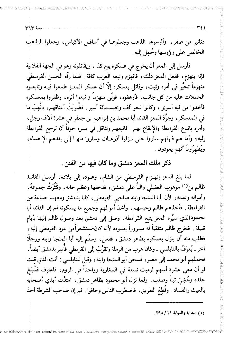 فأرسل إلى المعز أن يخرج في عسكره يوم كذا ويقاتلونه وهو في الجهة الفلانية فإنه ينهزم ففعل المعز ذلك فانهزم وتبعه العرب كافة فلما رآه الحسن القرمطي منهزما تحير في أمره وثبت وقاتل بعسكره إلا أن عسكر المعز طمعوا فيه وتابعوه الحملات عليه من كل جانب فأرهقوه فولى منهزما واتبعوا أثره وظفروا بمعسكره فأخذوا من فيه أسرى وكانوا نحو ألف وخمسمائة أسير فضربت أعناقهم ونهب ما في المعسكر وجرد المعز القائد أبا محمد بن إبراهيم بن جعفر في عشرة آلاف رجل وأمره باتباع القرامطة والإيقاع بهم فاتبعهم وتثاقل في سيره خوفا أن ترجع القرامطة إليه وأما هم فإنهم ساروا حتى نزلوا أذرعات وساروا منها إلى بلدهم الإحساء ويظهرون أنهم يعودون