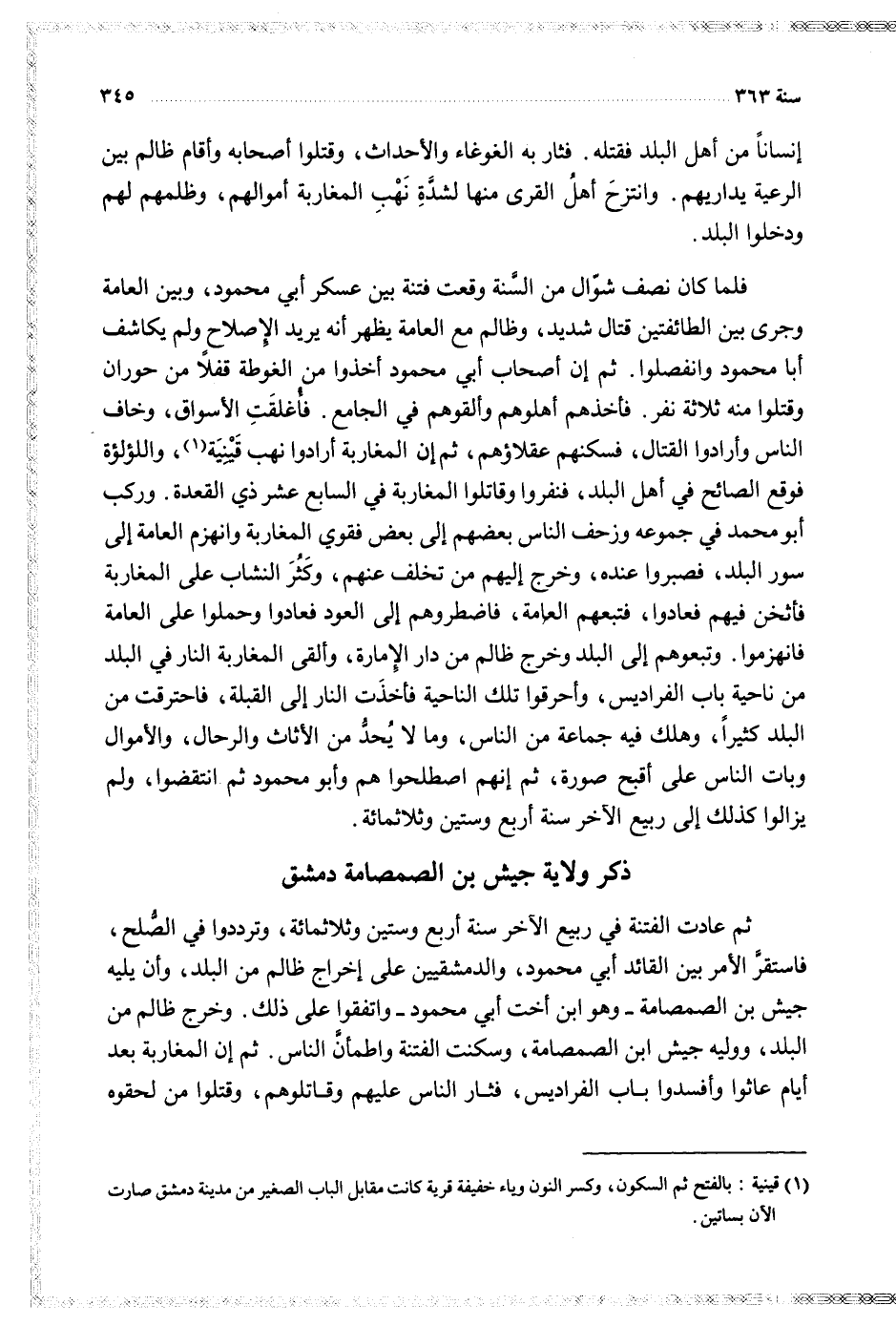 ثم عادت الفتنة في ربيع الآخر سنة أربع وستين وثلاثمائة وترددوا في الصلح فاستقر الأمر بين القائد أبي محمود والدمشقيين على إخراج ظالم من البلد وان يليه جيش بن الصمصامة وهو ابن أخت أبي محمود واتفقوا على ذلك وخرج ظالم من البلد ووليه جيش ابن الصمصامة وسكنت الفتنة واطمأن الناس ثم إن المغاربة بعد أيام عاثوا وأفسدوا باب الفراديس فثار الناس عليهم وقاتلوهم وقتلوا من لحقوه