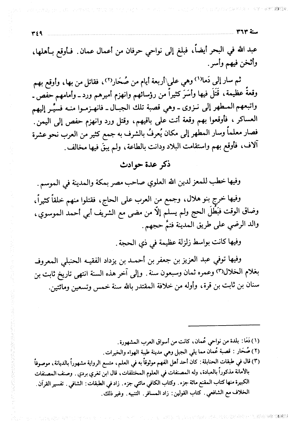 وفيها توفي عبد العزيز بن جعفر بن أحمد بن يزداد الفقيه الحنبلي المعروف بغلام الخلال وعمره ثثمان وسبعون سنة وإلى آخر هذه السنة انتهى تاريخ ثابت بن سنان بن ابت بن قرة وأوله من خلافة المقتدر بالله سنة خمس وتسعين ومائتين