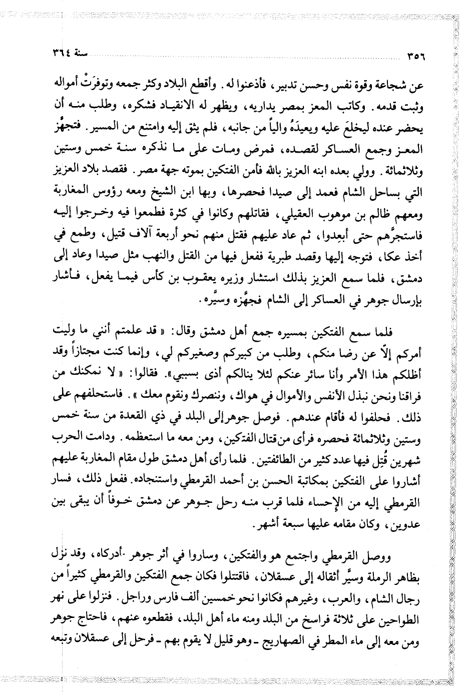عن شجاعة وقوة نفس وحسن تدبير فأدعنوا له وأقطع البلاد وكثر جمعه وتوفرت أمواله وثبت قدمه وكاتب المعز بمصر يداريه ويظظهر له الانقياد فشكره وطلب منه أن يحضر عنده ليخلع عليه ويعيده واليا من جانبه فلم يثق إليه وامتنع من المسير فتجهز المعز وجمع العساكر لقصده فمرض ومات على ما نذكره سنة خمس وستين وثلاثمائة وولي بعده ابنه العزيز بالله فأمن الفتكين بموته جهة مصر فقصد بلاد العزيز التي بساحل الشام فعمد الى صيدا فحصرها وبها ابن الشيخ ومعه رؤوس المغاربة ومعهم ظالم بن موهوب العقيلي فقاتلهم وكانوا في كثرة فطمعوا فيه وخرجوا إليه فاستجرهم حتى أبعدوا ثم عاد عليهم فقتل منهم نحو أربعة آلاف قتيل وطمع في أخذ عكا فتوجه إليها وقصد طبرية ففعل فيها من القتل والنهب مثل صيدا وعاد الى دمشق فلما سمع العزيز بذلك استشار وزيره يعقوب بن كأس فيما يفعل فأشار بإرسال جوهر في العساكر الى الشام فجهزه وسيره