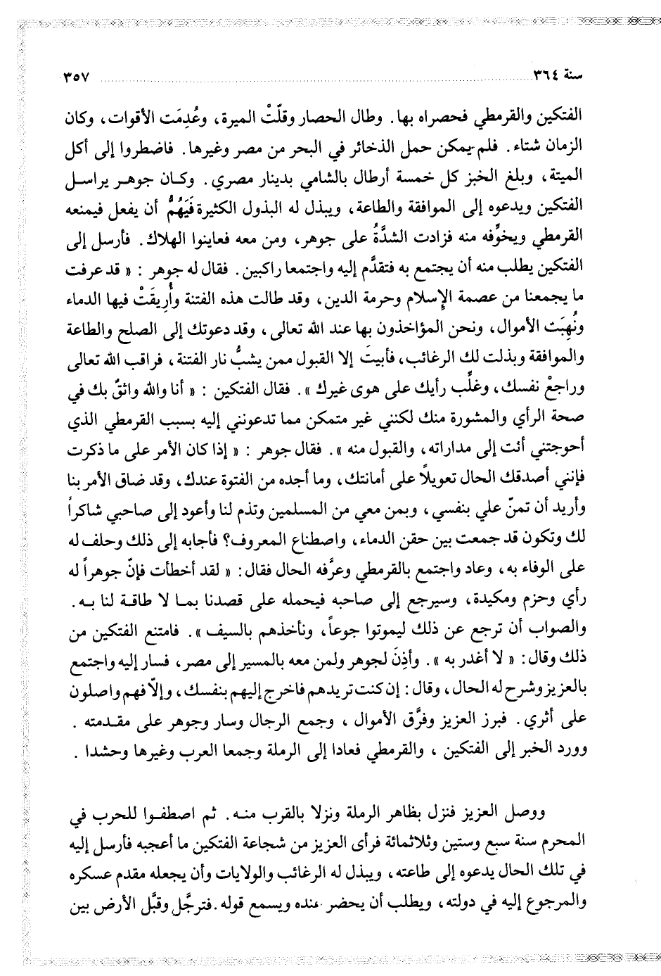 الفتكين والقرمطي فحصراه بها وطال الحصار وقلت الميرة وعدمت الأقوات وكان الزمان شتاء فلم يمكن حمل الذخائر في البحر من مصر وغيرها فاضطروا الى أكل الميتة وبلغ الخبز كل خمسة أرطال بالشامي بدينار مصري وكان جوهر يراسل الفتكين ويدعوه الى المرافقة والطاعة ويبذل له البذول الكثيرة فيهم أن يفعل فيمنه القرمطي ويخوفه منه فزادت الشدة على جوهر ومن معه فعاينوا الهلاك فأرسل الى الفتكين يطلب منه أن يجتمع به فتقدم إليه واجتمعا راكيبن فقال جوهر قد عرفت ما يجمعنا من عصمة الإسلام وحرمة الدين وقد طالت هذه الفتنة وأريقت فيها الدماء ونهبت الأوال ونحن المؤاخذون بها عند الله تعالى وقد دعوتك الى الصلح والطاعة والموافقة وبذلت لك الرغائب فأبيت إلا القبول ممن يشب نار الفتنة فراقب الله تعالى وراجع نفسك وغلب رأيك على هوى غيرك فقال الفتكين أنا والله واثق بك في صحة الرأي والمشورة منك لكنني غير متمكن مما تدعونني إليه بسبب القرمطي الذي أحوجتني أنت الى مداراته والقبول منه فقال جوهر إذا كان الأمر على ذكرت فإنني أصدقك الحال تعويلا على أمانتك وما أجده من الفتوة عندك وقد ضاق الأمر بنا واريد أن تمن علي نفسي وبمن معي من المسلمين وتذم لنا وأعود إلى صاحبي شاكرا لك وتكون قد جمعت بين حقن الدماء واصطناع المعروف فأجابه الى ذلك وحلف له على الوفاء به وعاد واجتمع بالقرمطي وعرفه الحال فقال لقد أخطات فإن جوهرا له رأي وحزم ومكيدة وسيرجع الى صاحبه فيحمله على قصدنا بما لا طاقة لنا به والصواب أن ترجع عن ذلك ليموتوا جوعا ونأخذهم بالسيف فامتنع الفتكين من ذلك وقال لا أغدر به وأذن لجوهر ولمن معه بالمسير الى مصر فسار إليه واجتمع بالعزيز وشرح له الحال وقال إن كنت تريدهم فاخرج إليهم بنفسك والا فهم واصلون على أثري فبرز العزيز وفرق الأموال وجمع الرجال وسار وجوهر على مقدمته وورد الخبر الى الفتكين والقرمطي فعادا الى الرملة وجمعا العرب وغيرها وحشدا
