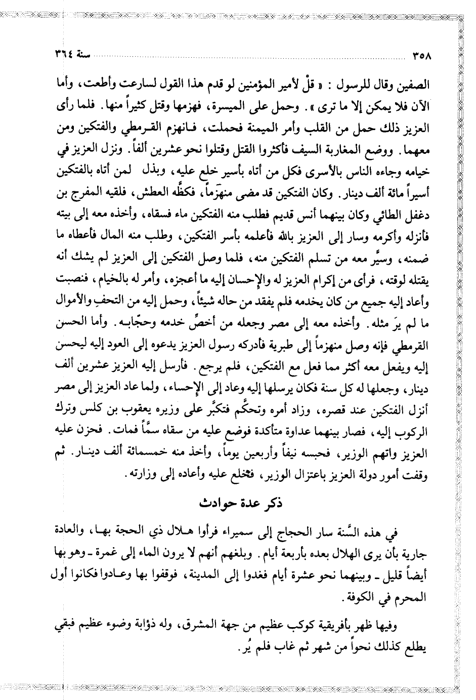الصفين وقال للرسول قل لأمير المؤمنين لو قدم هذا القول لسارعت وأطعت وأما الآن فلا يمكن إلا ما ترى وحمل على الميسرة فهزمها وقتل كثيرا منها فلما رأى العزيز ذلك حمل من القلب وأمر الميمنة فحملت فنهزم القرمطي والفتكين ومن معهما ووضع المغاربة السيف فأكثروا القتل وقتلوا نحو عشرين ألفا ونزل العزيز خيامه وجاءه الناس بالأسرى فكل من أتاه بأسير خلع عليه وبذل لمن أتاه الفتكين أسيرا مائة ألف دينار وكان الفتكين قد مضى منهزما فكظه العطش فلقيه المفرج بن دغفل الطائي وكان بينهما أنس قديم فطلب منه الفتكين ماء فسقاه وأخذه معه الى بيته فأنزله وأكرمه وسار الى العزيز بالله فأعلمه بأسر الفتكين وطلب منه المال فأعطاه ما ضمنه وسير معه من تسلم الفتكين منه فلما وصل الفتكين وطلب الى العزيز لم يشك أنه يقتله لوقته فرأى من إكرام العزيز له والإحسان إليه ما أعجزه وأمر له بالخيام فنصبت وأعاد إليه جميع من كان يخدمه فلم بفقد من حاله شيئا وحمل إليه من التحف والأموال ما لم ير مثله وأخذه معه الى مصر وجعله من أخص خدمه وحجابه وأما الحسن القرمطي فإنه وصل منهزما الى طبرية فأدركه رسول العزيز يدعوه الى العود إليه ليحسن إليه ويفعل معه أكثر مما فعل مع الفتكين فلم يرجع فأرسل إليه العزيز عشرين ألف دينار وجعلها له كل سنة فكان يرسلها إليه وعاد الى الإحساء ولما عاد العزيز الى مصر أنزل الفتكين عند قصره وزاد أمره وتحكم فتكبر على وزيره يعقوب بن كلس وترك الركوب إليه فصار بينهما عدواة متأكدة فوضع عليه من سقاه سما فمات فحزن عليه العزيز واتهم الوزير فحبسه نيفا وأربيعن يوما وأخذ منه خمسمائة ألف دينار ثم وقفت أمور دولة العزيز باعتزال الوزير فخلع عليه وأعاده الى وزارته