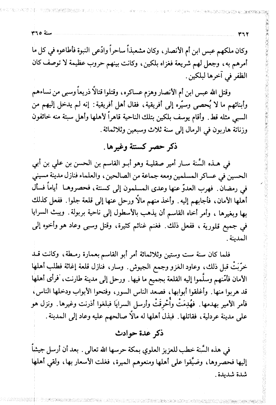 وقتل الله عبس ابن أم الأنصار وهزم عساكره وقتتلوا قتالا ذريعا وسبى من نساءهم وأبنائهم ما لا يحصى وسيره الى أفريقية فقال أهل أفريقية إنه لم يدخل إليهم من السبي مثله قط وأقام يوسف بلكين بتلك الناحية قاهرا لأهلها وأهل سبتة منه خائفون وزناتة هاربون في الرمال الى سنة ثلاث وثلاثمائة