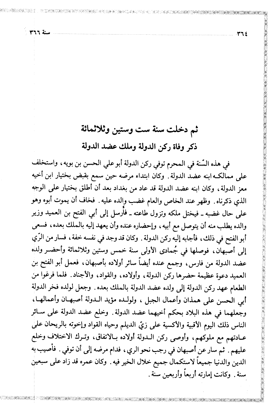 في هذه السنة في المحرم توفي ركن الدولة أبو علي الحسن بن بويه واستخلف على ممالكه ابنه عضد الدولة وكان ابتداء مرضه حين سمع بقبض بختيار ابن أخيه معز الدولة ومان ابنه عضد الدولة قد عاد من بغداد بعدا أن اطلق بختيار على الوجه الذي ذكرناه وظظهر عند الخاص والعام غضب والده عليه فخاف أن يموت أبوه وهو على حال غضبه فيختل ملكه وتزول طاعته فأرسل إلى أبي الفتح بن العميد وزير والده يطلب منه أن يتوصل مع أبيه واحضاره عنده وأن يتعهد إليه بالملك بعده فسعى أبو الفتح في ذلك فأجابه إليه ركن الدولة وكان قد وجد في نفسه خفة فسار من الري إلى اصبهان فوصلها في جمادى الأولى سنة خمس وستين وثلاثمائة واحضر ولده عضد الدولة من فارس وجمع عنده أيضا سائر أولاده باصبهان فعمل أبو الفتح بن العميد دعوة عظيمة حضرها ركن الدولة وأولاده والقواد والاجناد فلما فرغوا من الطعام عهد ركن الدولة إلى ولده عضد الدولة بالملك بعده وجعل لولده فخر الدولة أبي الحسن على همذان وأعمال الجبل ولولده مؤيد الدولة اصبهان وأعمالها وجعلهما في هذه البلاد بحكم احيهما عضد الدولة وخلع عضد الدولة على سائر الناس ذلك اليوم الاقبية والاكسية على زي الديلم وحياة القواد واخوته بالريحان على عادتهم مع ملوكهم واوصى ركن الدولة أولاده بالاتفاق وترك الاختلاف وخلع عليهم ثم سار عن اصبهان في رجب نحو الري فدام مرضه إلى أن توفي فاصيب به الدين والدينا جميعا لاستكمال جميع خلال الخير فيه وكان عمره قد زاد على سبعين سنة وكانت امارته أربعا وأربعين سنة