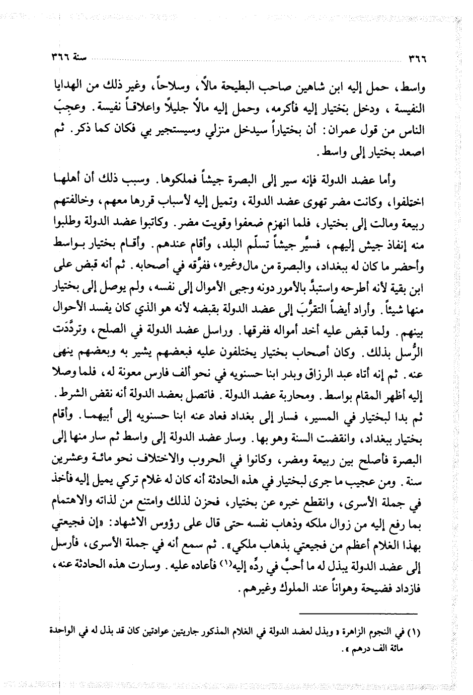 واما عضد الدولة فانه سير إلى البصرة جيشا فملكوها وسبب ذلك ان أهلها اختلفوا وكانت مضر تهوى عضد الدولة وتميل إليه لاسباب قررها معهم وخالفتهم ربيعة ومالت إلى بختيار فلما انهزم ضعفوا وقويت مضر وكاتبوا عضد الدولة وطلبوا منه انفاذ جيش إليهم فسير جيشا تسلم البلد وأقام عندهم وأقام بختيار بواسط واحضر ما كان له ببغداد والبصرة من مال وغيره ففرقه في أصحابه ثم إنه قبض على ابن يقية لانه اطرحه واستبد بالأمور دونه وجبى الأموال إلى نفسه ولم يوصل إلى بختيار منها شيئا واراد أيضا التقرب إلى عضد الدولة بقبضه لانه هو الذي كان يفسد الاحوال بينهم ولما قبض عليه اخذ أمواله ففرقها وراسل عضد الدولة في الصلح وترددت الرسل بذلك وكان أصحاب بختيار يختلفون عليه فبعضهم يشير به وبعضهم ينهى عنه ثمانه أتاه عبد الرزاق وبدر ابنا حسنويه فب نحو الف فارس معونة فلما وصلا إليه اظهر المقام بواسط ومحاربة عضد الدولة فاتصل بعضد الدولة انه نقض الشرط ثم بدا لبختيار في المسير فسار إلى بغداد فعاد عنه ابنا حسنويه إلى أبيهما وأقام بختيار ببغداد وانقضت السنة وهوبها وسار عضد الدولة إلى واسط ثم سار منها إلى البصرة فاصلح بين ربيعة ومضر وكانوا في الحروب والاختلاف نحو مائة وعشرين سنة ومن عجيب ما جرى لبختيار في هذه الحادثثة انه كان له غلام تركي يميل إليه فاخذ في جملة الاسرى وانقطع خبره عن بختيار فحزن لذلك وامتنع من لذاته والاهتمام بما رفع إليه من زوال ملكه وذهاب نفسه حتى قال على رؤوس الاشهاد ان فجيعتي بهذا الغلام اعظظم من ففجيعتي بذهاب ملكي ثم سمع انه في جملة الاسرى فأرسل إلى عضد الدولة يبذل له ما احب في رده إليه فاعاده عليه وسارت هذه الحادثة عنه فازداد فضحية وهوأنا عند الملوك وغيرهم
