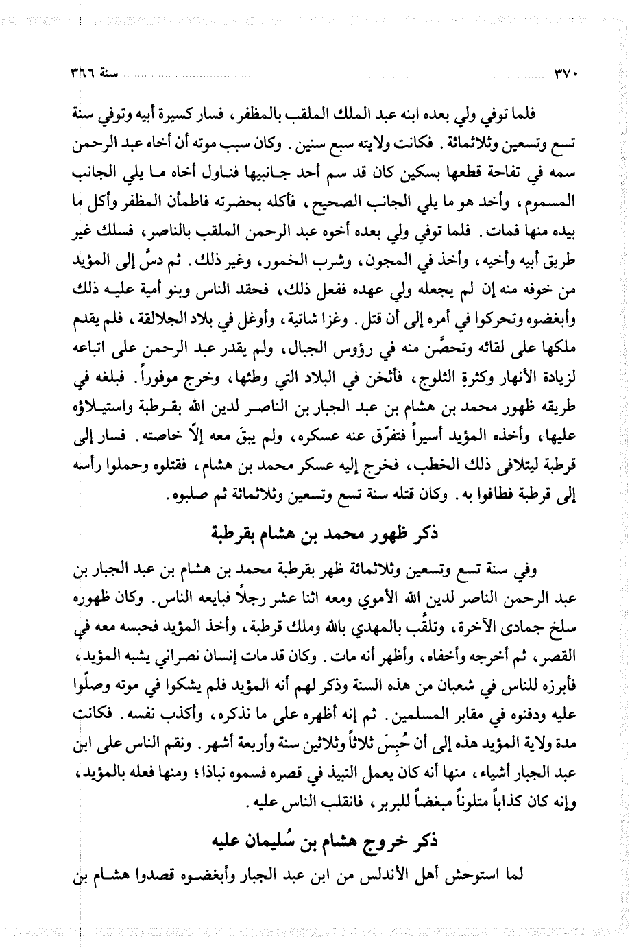 فلما توفي بعده ابنه عبد الملك الملقب بالمظفر فسار كسيرة أبيه وتوفي سنة تسع وتسعين وثلاثمائة فكانت ولايته سبع سنين وكان سبب موته ان أخاه عبد الرحمن سمه في تفاحة قطعها بسكين كان قد سم أحد جانبيها فنأول أخاه ما يلي الجانب المسموم واخذ هو ما يلي الجانب الصحيح فاكله بحضرته فاطمان المظفر واكل ما بيده منها فمات فلما توفي ولي بعده اخوه عبد الرحمن الملقب بالناصر فسلك غير طريق أبيه وأخيه واخذ في المجون وشرب الخمرو وغير ذلك ثم دس إلى المؤيد من خوفه منه ان لم يجعله ولي عهده ففعل ذلك فحقد الناس وبنو امية عليه ذلك وابغضوه وتحركوا في أمره إلى ان قتل وغزا شاتية واوغل في بلاد الجلالقة فلم يقدم ملكها على لقائه وتحصن منه في رؤوس الجبال ولم يقدر عبد الرحمن على اتباعه لزيادة الانهار وكثرة الثلوج فاثخن في البلاد التي وطئها وخرج موفورا فبلغه في طريقه ظهور محمد بن عبد الجبار بن الناصر لدين الله بقرطبة واستيلاؤه عليها واخذه المؤيد اسيرا فتفرق عنه عسكره ولم يبق معه إلا خاصته فسار إلى قرطبة ليتلافى ذلك الخطب فخرج إليه عسكر محمد بن هشام فقتلوه وحملوا رأسه إلى قرطبة فطافوا به وكان قتله سنة تسع وتسعين وثلاثمائة ثم صلبوه