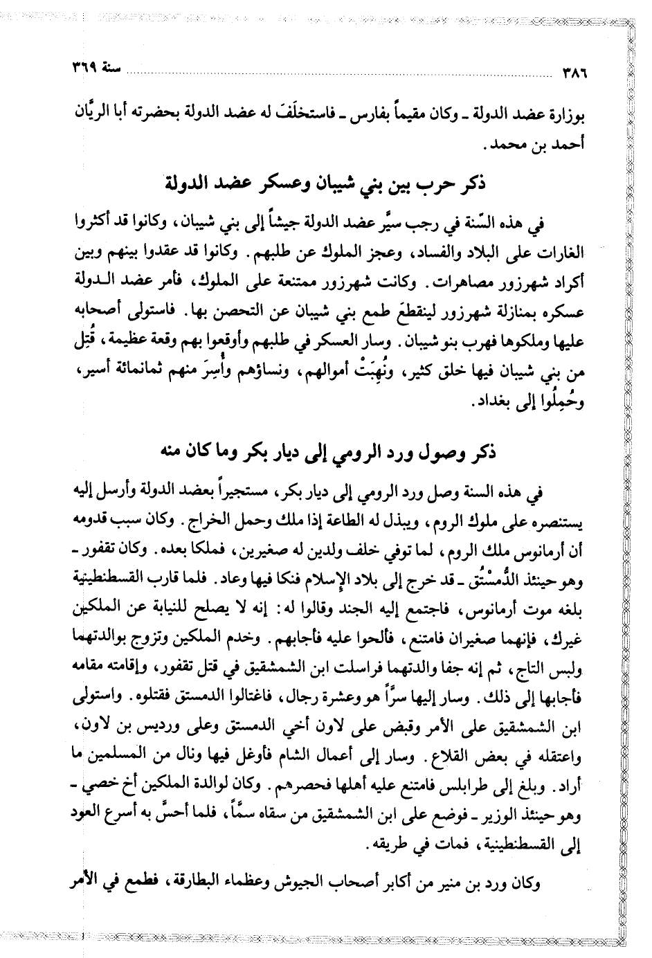 في هذه السنة وصل ورد الرومي إلى ديار بكر مستجيرا بعضد الدولة وأرسل إليه يستنصره على ملوك الروم ويبذل له الطاعة اذا ملك وحمل الخراج وكان سبب قدومه ان ارمانوس ملك الروم لما توفي خلف ولدين صغيرين فملكا بعده وكان تقفوز وهو حينئذ الدمستق قد خرج إلى بلاد الاسلام فنكا فيها وعاد فلما قارب القسطنطينية بلغه موت ارمانوس فاجتمع إليه الجند وقالوا له انه لا يصلح للنيابة عن الملكين غيرك فانهما صغيران فامتنع فالحوا عليه فأجابهم وخدم الملكين وتزوج بوالدتهما ولبس التاج ثم إنه جفا والدتهما فراسلت ابن الشمشقيق في قتل تقفور وأقامته مقامه فأجابها إلى ذلك وسار إليها سرا هو وعشرة رجال فاغتالوا الدمستق فقتلوه واستولى ابن الشمشقيق على الأمر وقبض على لاون اخي الدمستق وعلى ورديس بن لاون واعتقله في القلاع وسار إلى أعمال الشام فاوغل فيها ونال من المسلمين ما اراد وبلغ إلى طرابلس فامتنع عليه أهلها فحصرهم وكان لوالدة الملكين اخ خصي وهو حينئذ الوزير فوضع على ابن الشمشقيق من سقاه سماه فلما احس به اسرع العود إلى القسطنطينية فمات في طريقه