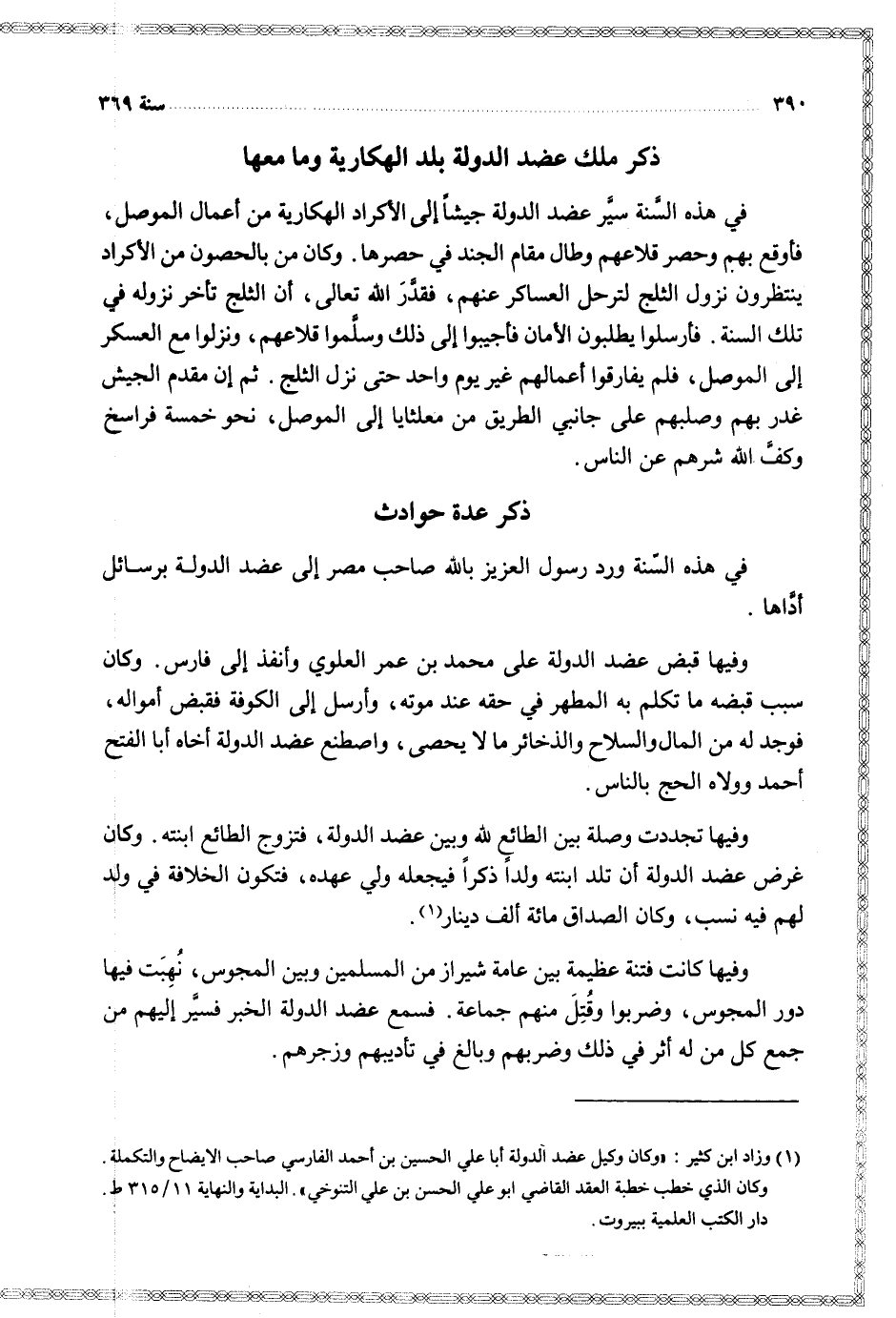 وفيها كانت فتنة عظيمة بين عامة شيراز من المسلمين وبين المجوس نهبت فيها دور المجوس وضربوا وقتل منهم جماعة فسمع عضد الدولة الخبر فسير إليهم من جمع كل من له أثر في ذلك وضربهم وبالغ في تاديبهم وزجرهم