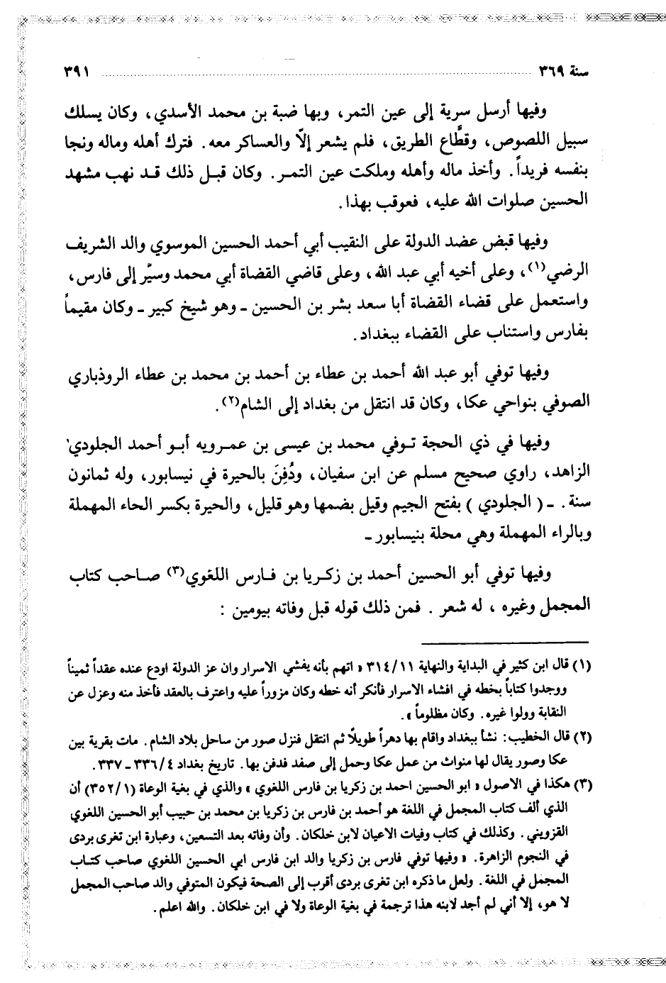 وفيها توفي أبو الحسين أحمد بن زكريا بن فاس اللغوي صاحب كتاب المجمل وغيره له شعر فمن ذلك قوله قبل وفاته بيومين
