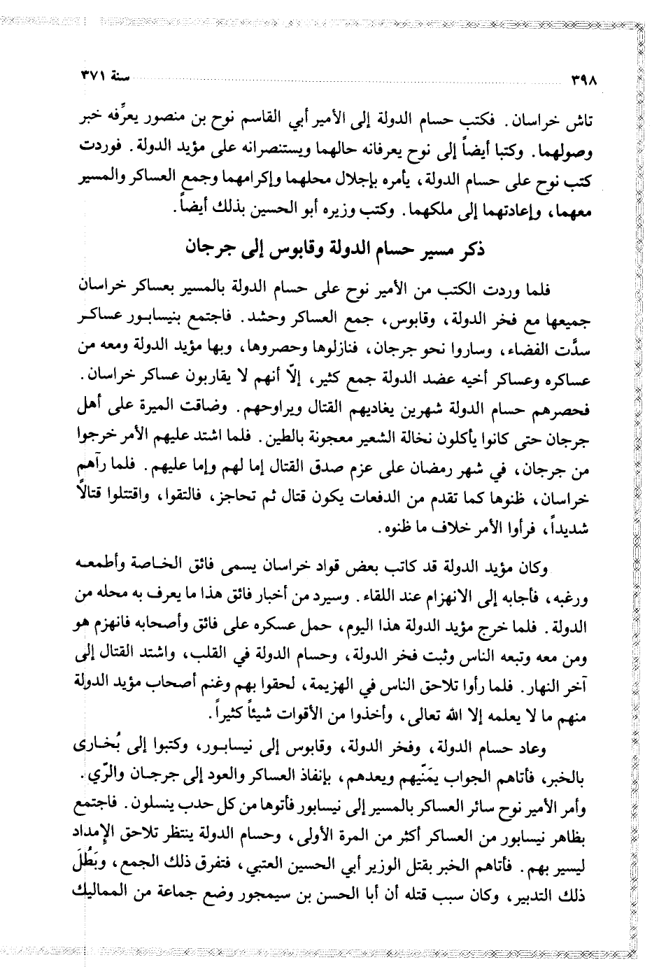 فلما وردت الكتب من الأمير نوح على حسام الدولة بالمسير بعساكر خراسان جميعها مع فخر الدولة وقأبوس جمع العساكر وحشد فاجتمع بنيسابور عساكر سدت الفضاء وساروا نحو جرجان فنازلوها وحصروها وبها مؤيد الدولة ومعه من عساكره وعساكر أخيه عضد الدولة جمع كثير إلا انهم لا يقاربون عساكر خراسان فخصرهم حسام الدولة شهرين يغاديهم القتال ويراوحهم وضاقت الميرة على أهل جرجان حتى كانوا ياكلون نخالة الشعير معجونة بالطين فلما اشتد عليهم الأمر خرجوا من جرجان فس شهر رمضان على عزم صدق القتال اما لهم واما عليهم فلما راهم خراسان ظنوها كما تقدم من الدفعات يكون قتال ثم تحاجز فالتقوا واقتتلوا قتالا شديدا فراوا الأمر خلاف ما ظنوه