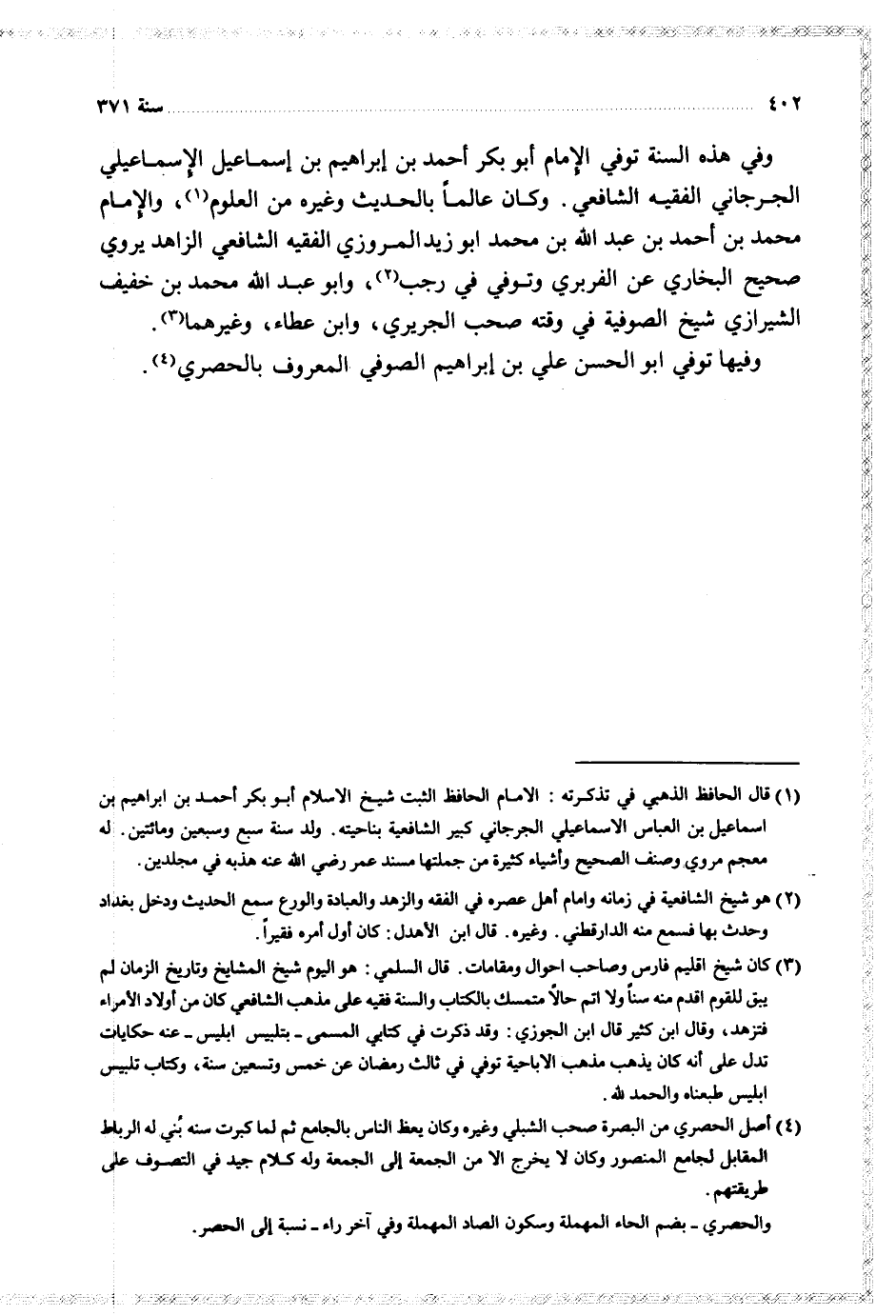 وفي هذه السنة توفي الامام أبو بكر أحمد بن إبراهيم بن اسماعيل الاسماعيلي الجرجاني الفقيه الشافعي وكان عالما بالحديث وغيره من العلوم والامام محمد بن أحمد بن عبد الله بن محمد أبو زيد المروزي الفقيه الشافعي الزاهد يروى صحيح البخاري عن الفربري وتوفي في رجب وأبو عبد الله محمد بن خفيف الشيرازي شيخ الصوفية في وقته صحب الجريري وابن عطاء وغيرهما