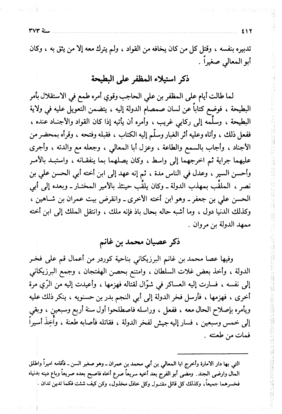وفيها عصى محمد بن غانم البرزيكاتي بناحية كوردر من أعمال قم على فخر الدولة واخذ بعض غلات السلطان وامتنع بحصن الهفتجان وجمع البرزيكاتي إلى نفسه فسارت إليه العساكر في شوال لقتاله فهزمها واعيدت إليه من الري مرة اخرى فهزمها فأرسل فخر الدولة إلى أبي النجم بدر بن حسنويه ينكر ذلك عليه ويأمره باصلاح الحال معه ففعل وراسله فاصطلحوا أول سنة أربع وسبعين وبقي إلى خمس وسبيعن فسار إليه جيش لفخر الدولة فقاتله فاصابه طعنة واخذ اسيرا فمات من طعنته
