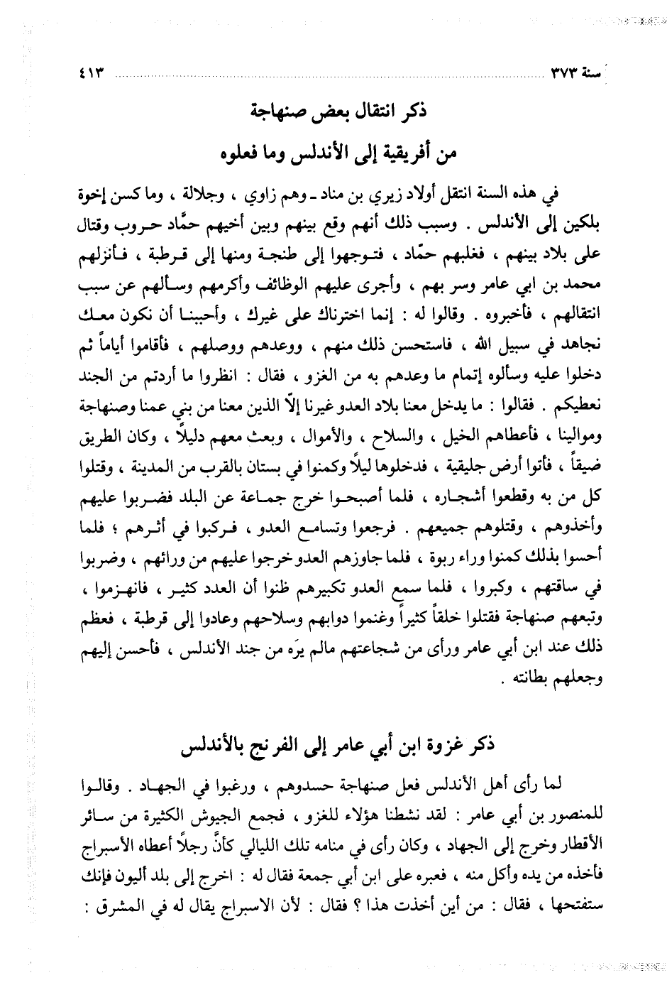 في هذه السنة انتقل أولاد زيري بن مناد وهم زاوي وجلالة وماكسن اخوة بلكين إلى الأندلس وسبب ذلك انهم وقع بينهما وبين أخيهم حماد حروب وقتال على بلاد بينهم فغلبهم حماد فتوجهوا إلى طنجة ومنها إلى قرطبة فانزلهم محمد بن أبي عأمر وسر بهم واجرى عليهم الوظائف واكرمهم وسالهم عن سبب انتقاله فاخبروه وقالوا له انما اخترنك على غيرك واحببنا ان نكون معك نجاهد في سبيل الله فاستحسن ذلك منهم ووعدهم ووصلهم فأقاموا أياما ثم دخلوا عليه وسالوه اتمام ما وعدهم به من الغزو فقال انظروا ما اردتم من الجند نعطيكم فقالوا ما يدخل معنا بلاد العدو غيرنا إلا الذين معنا من بني عمنا وصنهاجة وموالينا فاعطيهم الخيل والسلاح والأموال وبعث معهم دليل وكان الطريق ضيقا فاتوا أرض جليقية فدخلوها ليلا وكمنوا في بستان بالقرب من المدينة وقتلوا كل من به وقطعوا اشجاره فلما اصبحوا خرج جماعة عن البلد فضربوا عليهم واخذوهم وقتلوهم جميعا فرجوا وتسامع العدو فركبوا في أثرهم فلما احسوا بذلك كمنوا وارء ربوة فلما جاوزهم العدو خرجوا عليهم من ورائهم وضربوا في ساقتهم وكبروا فلما سمع العدو تكبيرهم ظنوا ان العدد كثير فانهزموا وتبعهم صنهاجة فقتلوا خلقا كثيرا وغنموا دوابهم وسلاحهم وعادوا إلى قرطبة فعظم ذلك عند ابن أبي عأمر ورأى من شجاعتهم ما لم يره من جند الأندلس فاحسن إليهم وجعلهم بطانته