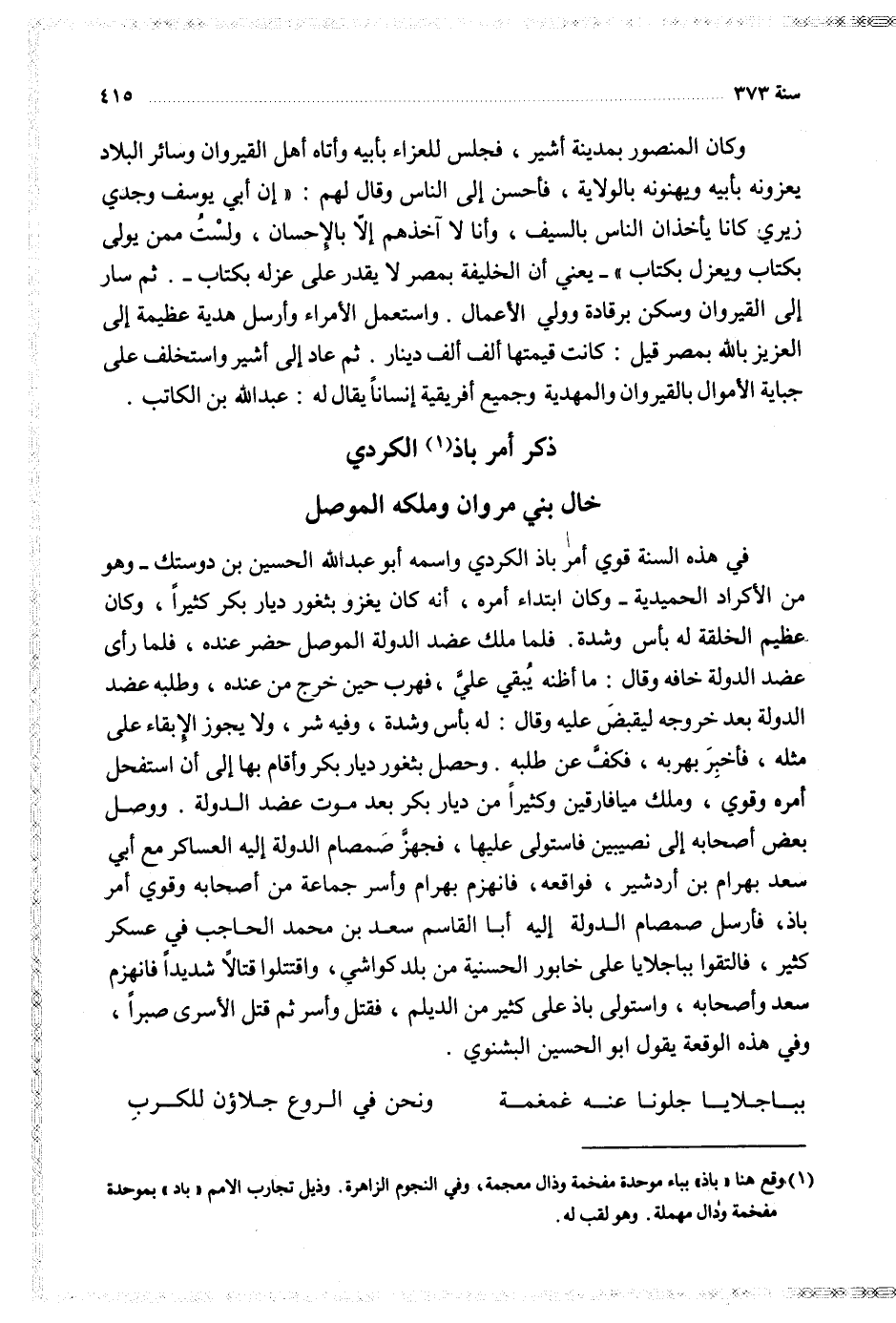 في هذه السنة قوي أمر باذ الكردي واسمه أبو عبد الله الحسين بن دوستك وهو من الاكراد الحميدية وكان ابتداء أمره انه كان يغزو بثغور ديار بكر كثيرا وكان عظيم الخلقة له باس وشدة فلما ملك عضد الدولة الموصل حضر عنده فلما رأى عضد الدولة خافه وقال ما اظنه يبقي علي فهرب حين خرج من عنده وطلبه عضد الدولة بعد خروجه ليقبض عليه وقال له باس وشدة وفيه شر ولا يجوز الابقاء على مثله فاخبر بهربه فكف عن طلبه وحصل بثغور ديار بكر وأقام بها إلى ان استفحل أمره وقوي وملك ميافارقين وكثيرا من ديار بكر بعد موت عضد الدولة ووصل بعد أصحابه إلى نصيبين فاستة لى عليها فجهز صمصام الدولة إليه العساكر مع أبي سعد بهرام بن اردشير فواقعه فانهزم بهرام واسر جماعة من أصحابه وقوي أمر باذ فأرسل صمصام الدولة إليه ابا القاسم سعد بن محمد الحاجب في عسكر كثير فالتقوا بباجلايا على خأبور الحسينة من بلد كواشي واقتتلوا قتالا شديدا فانهزم سعد وأصحابه واستولى باذ على كثير من الديلم فقتل واسر ثم قتل الاسرى صبرا وفي هذه الوقعة يقول أبو الحسين البشنوي