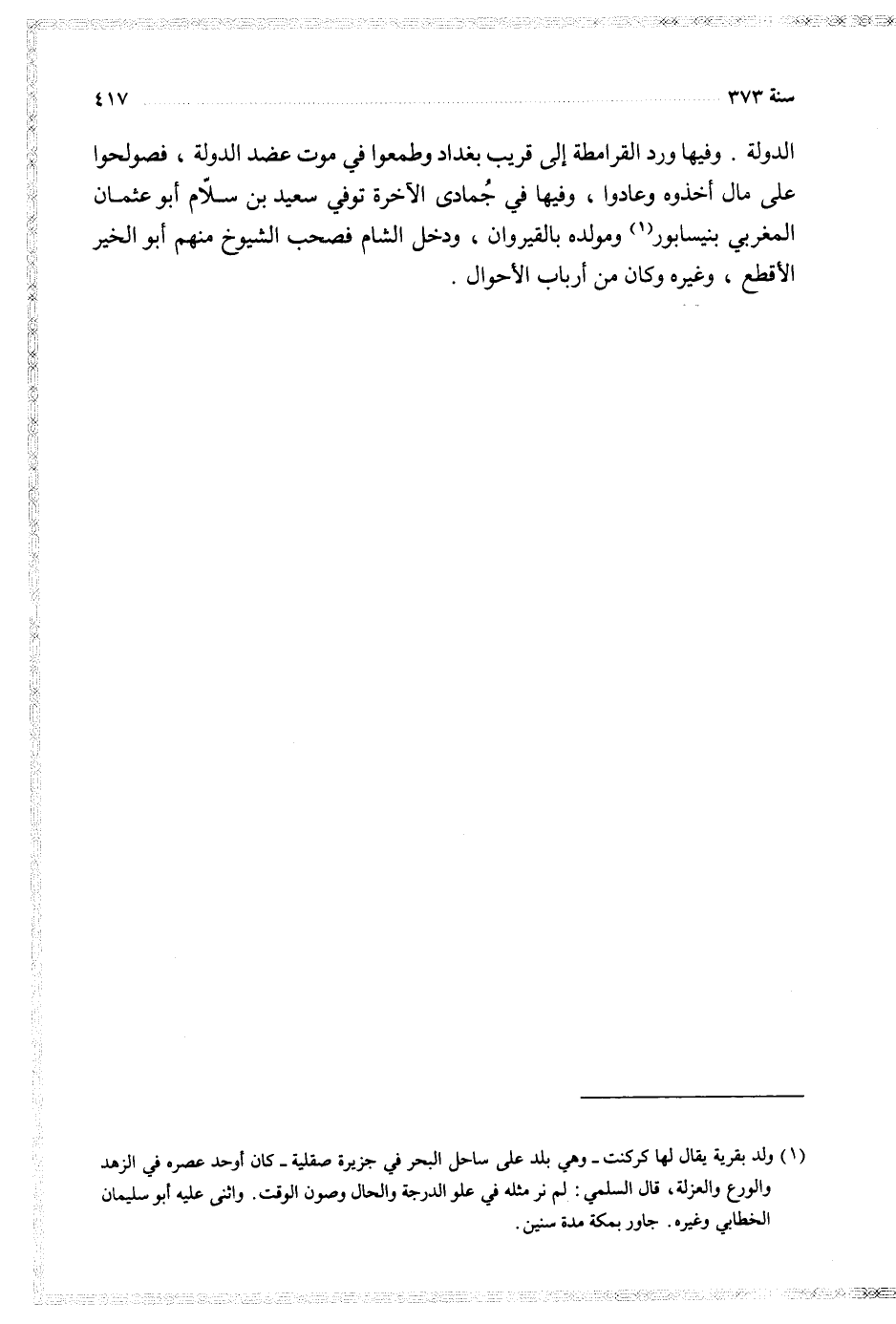 الدولة وفيها ورد القرامطة إلى قريب بغداد وطمعوا في موت عضد الدولة فصولحوا على مال اخذوه وعادوا وفيها في جمادى الاخرة توفي سعيد بن سلام أبو عثمان المغربي بنيسابور ومولده بالقيروان ودخل الشام فصحب الشيوخ منهم أبو الخير الاقطع وغيره وكان من ارباب الاحوال
