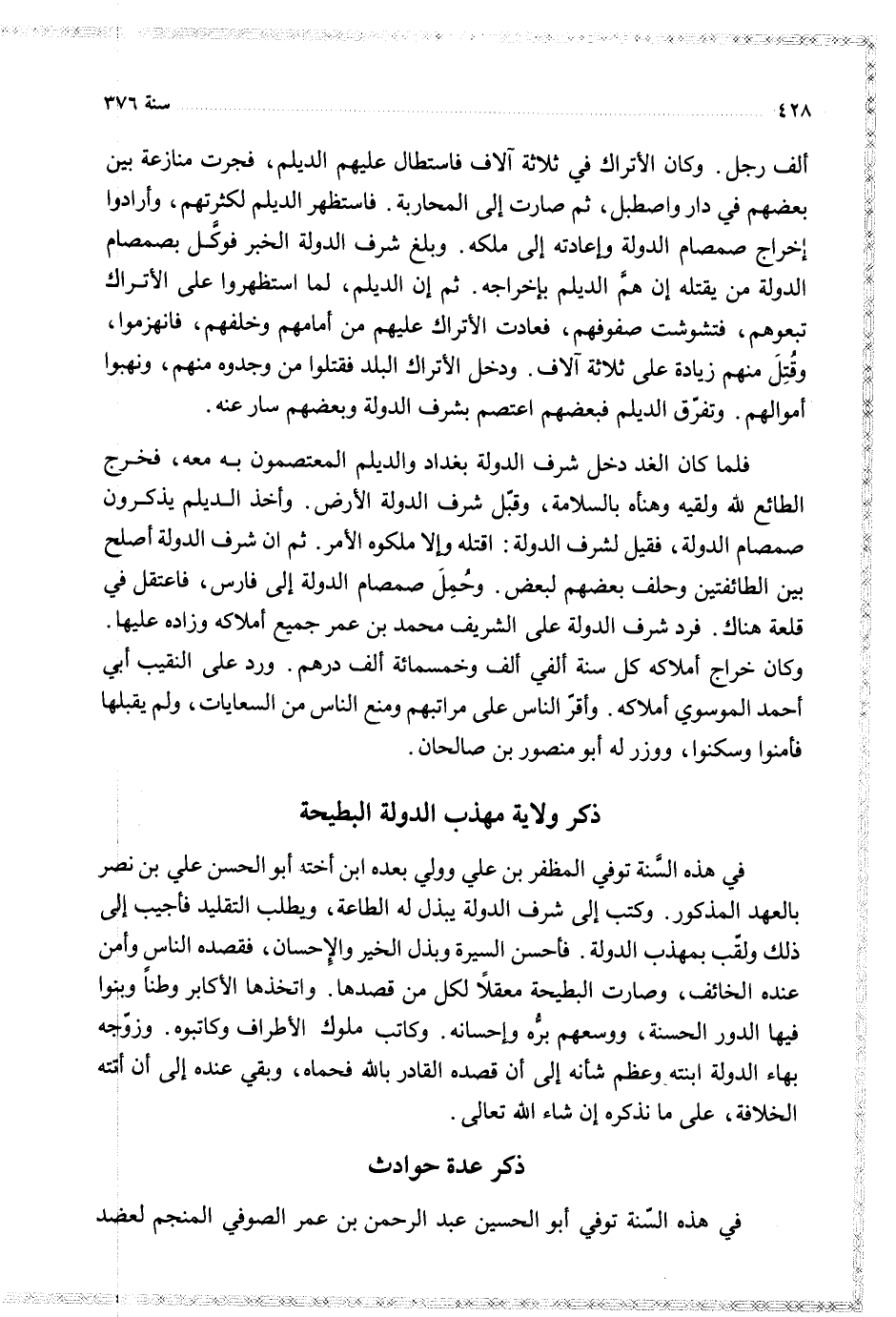 في هذه السنة توفي أبو الحسين عبد الرحمن بن عمر الصوفي المنجم لعضد