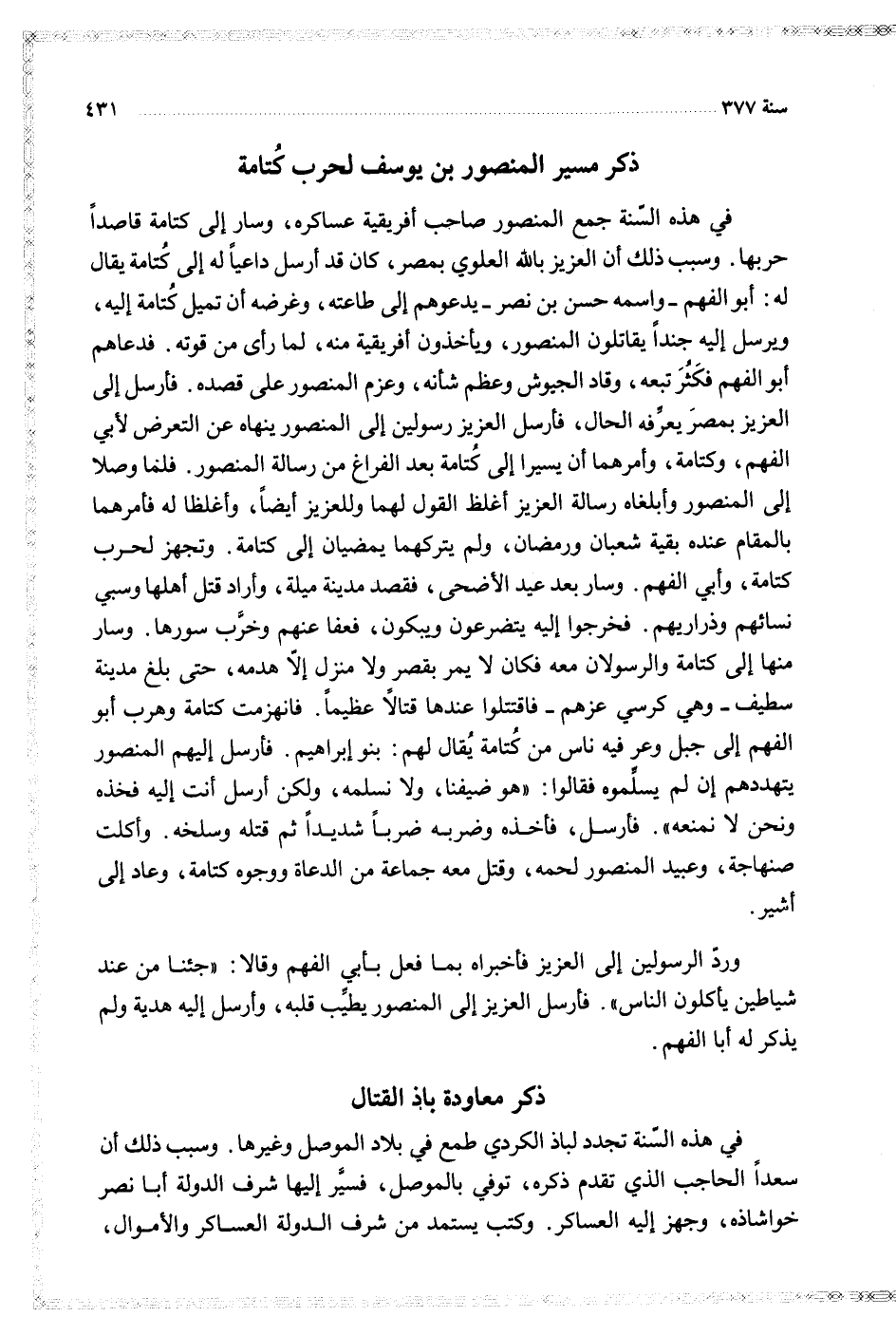 في هذه السنة جمع المنصور صاحب أفريقية عساكره وسار إلى كتامة قاصدا حربها وسبب ذلك ان العزيز بالله العلوي بمصر كان قد أرسل داعيا له إلى كتامة يقال له أبو الفهم واسمه حسن بن نصر يدعوهم إلى طاعته وغرضه ان تميل كتامة إليه ويرسل إليه جندا يقاتلون المنصور وياخذون أفريقية منه لما رأى من قوته فدعاهم أبو الفهم فكثر تبعه وقاد الجيوش وعظم شانه وعزم المنصور على قصده فأرسل إلى العزيز بمصر يعرفه الحال فأرسل العزيز رسولين إلى المنصور ينهاه عن التعرض لأبي الفهم وكتامة وأمرهما ان يسيرا إلى كتامة بعد الفراغ من رسالة المنصور فلما وصلا إلى المنصور وابلغاه رسالة العزيز اغلظ القول لهما وللعزيز أيضا واغلظا له فأمرهما بالمقام عنده بقية شعبان ورمضان ولم يتركهما يمضيان إلى كتامة فتجهز لحرب كتامة وأبي الفهم فسار بعد عيد الاضحى فقصد مدينة ميلة واراد قتل أهلها وسبي نسائهم وذراريهم فخرجوا إليه يتضرعون ويبكون فعفا عنهم وخرب سورها وسار منها إلى كتامة والرسولان معه فكان لا يمر لقصر ولا منزل إلا هدمه حتى بلغ مدينة سطيف وهي كرسي عزمهم فاقتتلوا عندها قتالا عظيما فانهزمت كتامة وهرب أبو الفهم إلى جبل وعر فيه ناس من كتامة قال لهم بنو إبراهيم فأرسل إليهم المنصور يتهددهم ان لم يسلموه فقالوا هو ضيفنا ولا نسلمه ولكن أرسل انت إليه فخذه ونحن لا نمنعه فأرسل فاخذه وضربه ضربا شديدا ثم قتله وسلخه واكلت صنهاجة وعبيد المنصور لحمه وقتل معه جماعة من الدعاة ووجوه كتامة وعاد إلى اشير