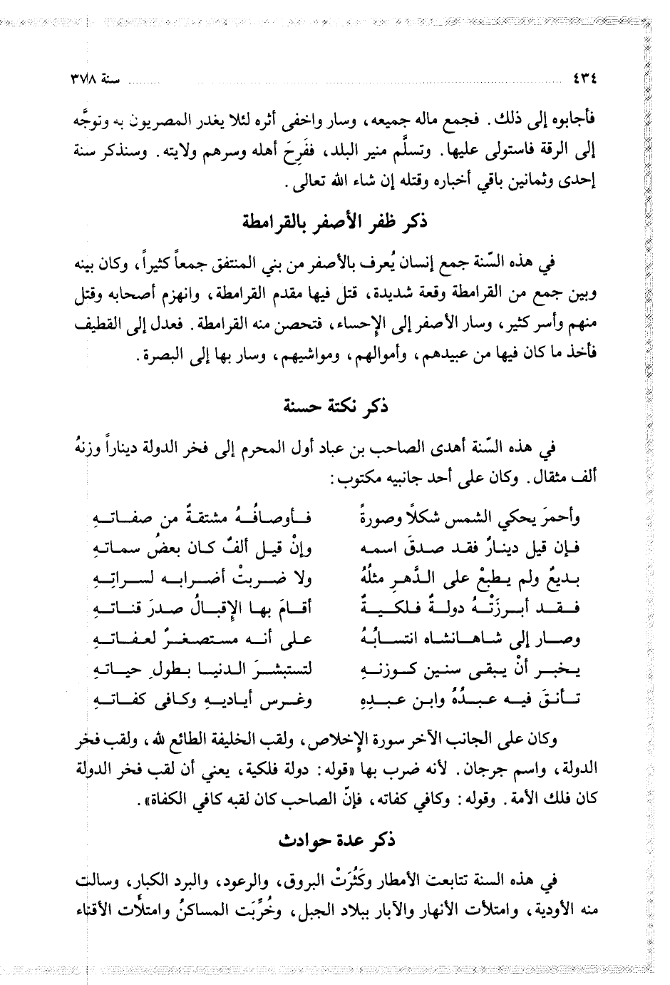 وكان على الجانب الاخر سورة الاخلاص ولقب الخليفة الطائع لله ولقب فخر الدولة واسم جرجان لانه ضرب بها قوله دولة فلكية يعني ان لقب فخر الدولة كان فلك الامة وقوله زكافي كفاته فان الصاحب كان لقبه كافي الكفاة