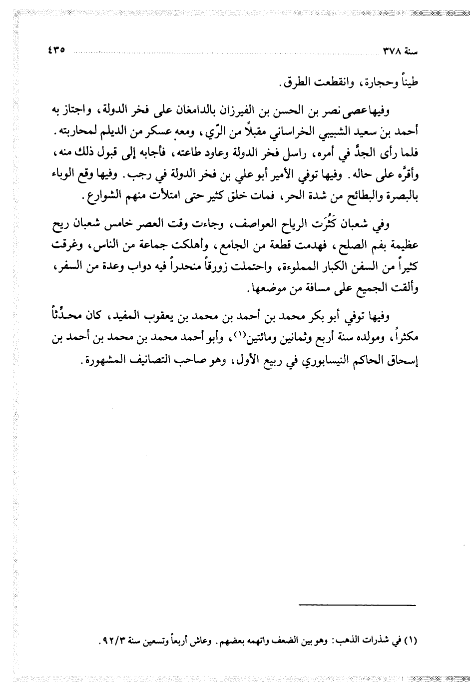 وفيها توفي أبو بكر محمد بن أحمد بن محمد بن يعقوب المفيد كان محدثا مكثرا ومولده سنة أربع وثمانين ومائتين وأبو أحمد محمد بن محمد بن أحمد بن إسحاق الحاكم النيسابوري في ربيع الأول وهو صاحب التصانيف المشهورة
