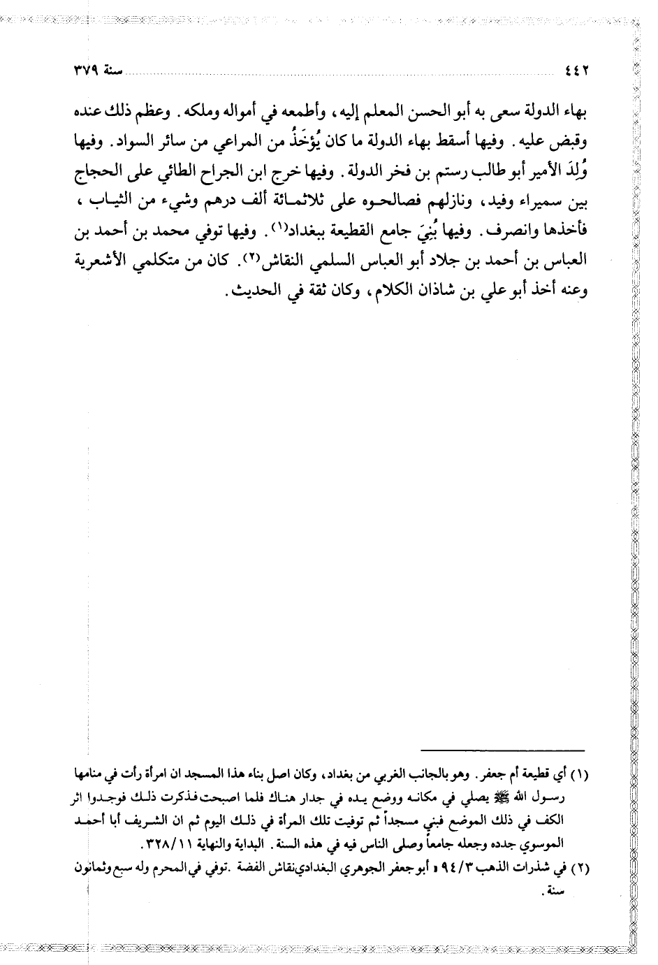 بهاء الدولة سعى به أبو الحسن المعلم إليه وأطعمه في أمواله وملكه وعظم ذلك عنده وقبض عليه وفيها أسقط بهاء الدولة ما كان يؤخذ من المراعي من سائر السواد وفيها ولد الأمير أبو طالب رستم بن فخر الدولة وفيها خرج ابن الجراح الطائي على الحجاج بين سميراء وفيد ونازلهم فصالحوه على ثلاثمائة ألف درهم وشيء من الثياب فأخذها وانصرف وفيها بني جامع القطيعة ببغداد وفيها توفي محمد بن أحمد بن العباس بن أحمد بن جلاد أبو العباس السلمي النقاش كان من متكلمي الأشعرية وعنه أخذ أبو علي بن شاذان الكلام وكان ثقة في الحديث