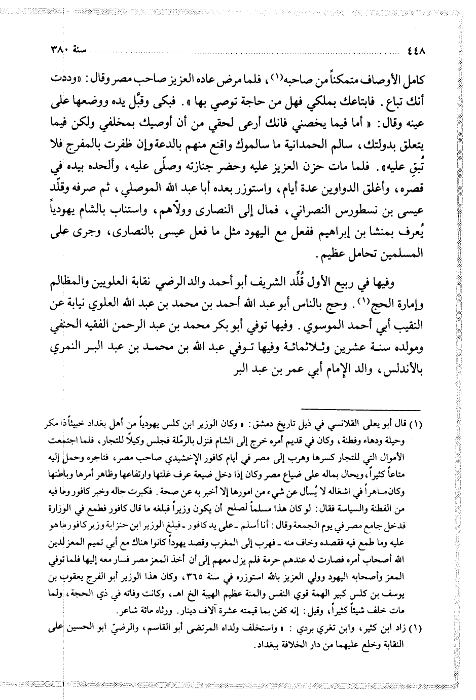كاما الأوصاف متمكنا من صاحبه فلما مرض عاده العزيز صاحب مصر وقال وددت أنك تباع فابتاعك بملكي فهل من حاجة توصي بها فبكى وقبل يده ووضعها على عينه وقال أما فيما يخصني فانك أرعى لحقي من أن أوصيك بمخلفي ولكن فيما يتعلق بدولتك سالم الحمدانية ما سالموك واقنع منهم بالدعة وان ظفرت بالمفرج فلا تبق عليه فلما مات حزن العزيز عليه وحضر جنازته وصلى عليه وألحده بيده في قصره وأغلق الدواوين عدة أيام واستوزر بعده أبا عبد الله الموصلي ثم صرفه وقلد عيسى بن نسطورس النصراني فمال إلى النصارى وولاهم واستناب بالشام يهوديا يعرف بمنشا بن إبراهيم ففعل مع الهيود مثل ما فعل عيسى بالنصارى وجرى على المسلمين تحامل عظيم