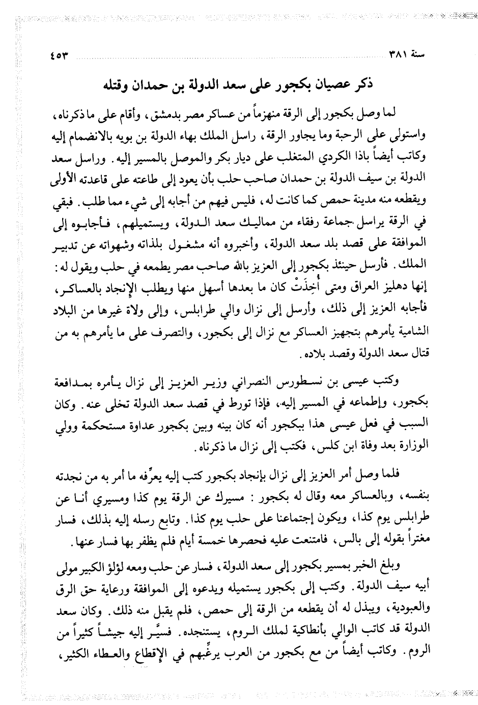 لما وصل بكجور إلى الرقة منهزما من عساكر مصر بدمشق وأقام على ما ذكرناه واستولى على الرحبة وكا يجاور الرقة راسل الملك بهاء الدولة بن بويه بالأنضمام إليه وكاتب أيضا باذا الكردي المتغلب على ديار بكر والموصل بالمسير إليه وراسل سعد الدولة بن سيف الدولة بن حمدان صاحب حلب بأن يعود إلى طاعته على قاعدته الأولى ويقطعه منه مدينة حمص كما كانت له فليس فيهم من أجابة إلى شيء مما طلب فبقي في الرقة يراسل جماعة رفقاء من مماليك سعد الدولة ويستميلهم فأجابوه إلى الموافقة على قصد بلد سعد الدولة وأخبروه أنه مشغول بلذاته وشهواته عن تدبير الملك فأرسل حينئذ بكجور إلى العزيز بالله صاحب مصر يطمعه في حلب ويقول له إنها دهليز العراق ومتى أخذت كام ما بعدها أسهل منها ويطلب الإنجاد بالعساكر فأجابه العزيز إلى ذلك وأرسل إلى نزال والي طرابلس والى ولاة غيرها من البلاد الشامية يأمرهم بتجهيز العساكر مع نزال إلى بكجور والتصرف على ما يأمرهم به من قتال سعد الدولة وقصد بلاده