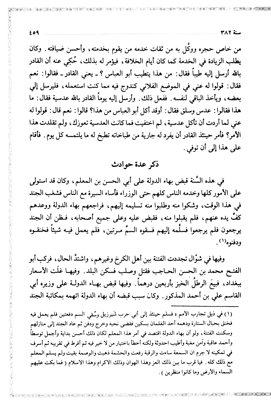 وفيها في شوال تجددت الفتنة بين أهل الكرخ وغيرهم واشتد الحال فركب أبو الفتح محمد بن الحسن الحاجب فقتل وصلب فسكن البلد وفيها غلت الأسعار ببغداد فبيع الرطل الخبز بأربعين درهما وفيها قبض بهاء الدولة على وزيره أبي القاسم علي بن أحمد المذكور وكان سبب قبضه أن بهاء الدولة اتهمه بمكاتبة الجند