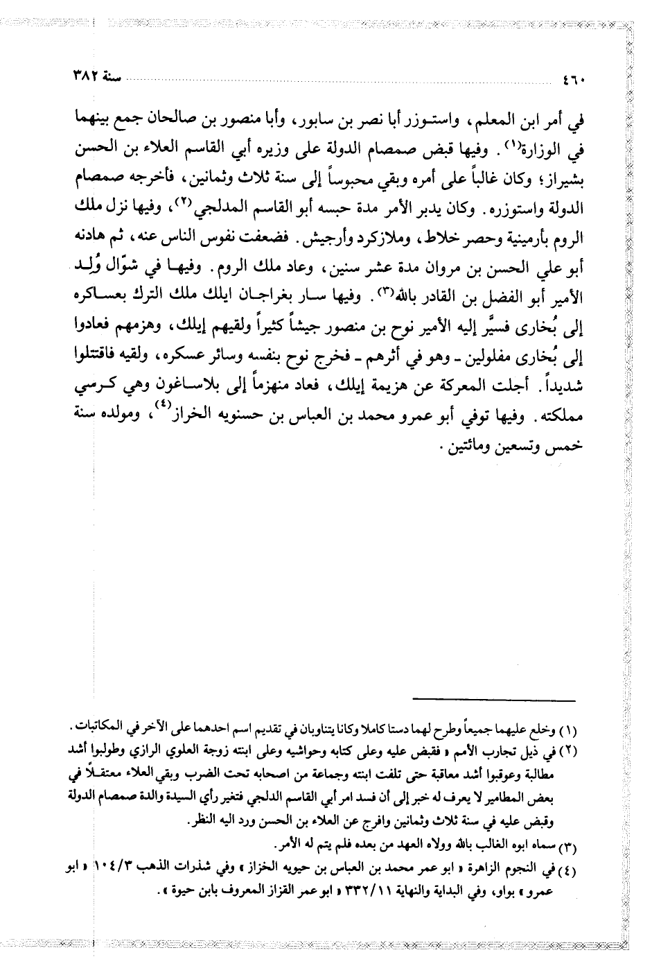 في أمر ابن المعلم واستوزر أبا نصر بن سابور وأبا منصور بن صالحان جمع بينهما في الوزارة وفيها قبض صمصام الدولة على وزيره أبي القاسم العلاء بن الحسن بشيراز وكان غالبا على أمره وبقي محبوسا إلى سنة ثلاث وثمانين فأخرجه صمصام الدولة واستوزره وكان يدبر الأمر مدة حبسه أبو القاسم المدلجي وفيها نزل ملك الروم بأرمينية وحصر خلاط وملازكرد وأرجيش فضعفت نفوس الناس عنه ثم هادنه أبو علي الحسن بن مروان مدة عشر سنين وعاد ملك الروم وفيها في شوال ولد الأمير أبو الفضل بن القادر بالله وفيها سار بغراجان ايلك ملك الترك بعساكره إلى بخارى فسير إليه الأمير نوح بن منصور جيشا كثيرا ولقيهم ايلك وهزمخم فعادوا إلى بخارى مفلولين وهو في أثرهم فخرج نوح بنفسه وسائر عسكره ولقيه فاقتتلوا شديدا أجلت المعركة عن هزيمة ايلك فعاد منهزما إلى بلاساغون وهي كرسي مملكته وفيها توفي أبو عمرو محمد بن العباس بن حسنويه الخراز ومولده سنة خمس وتسعين ومائتين