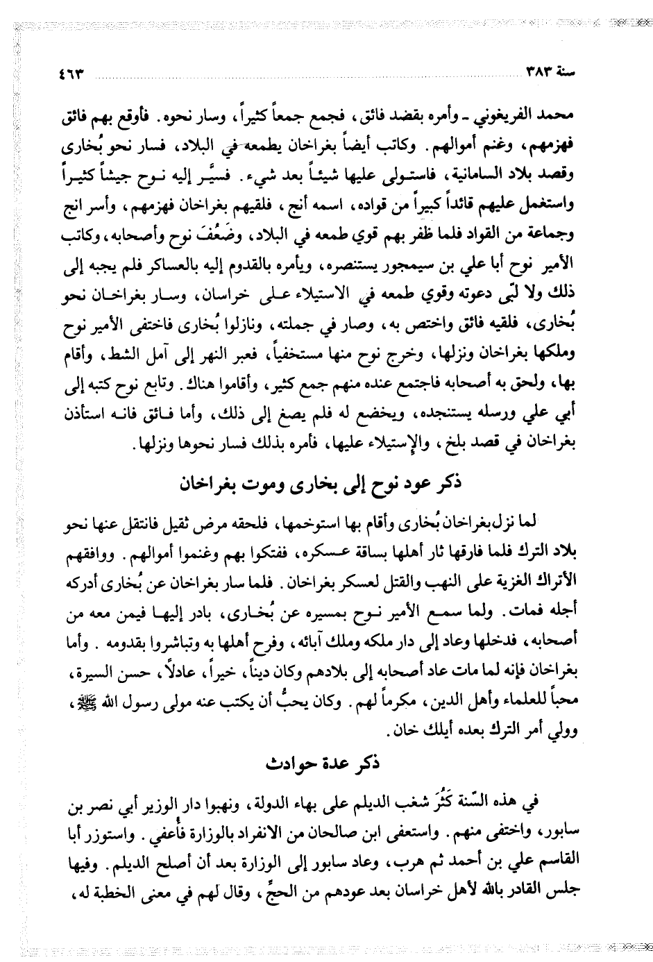 محمد الفريغوني وأمره بقصد فائق فجمع جمعا كثيرا وسار نحوه فأوقع بهم فائق فهزمهم وغنم أموالهم وكاتب أيضا بغراخان يطمعه في البلاد فسار نحو بخارى وقصد بلاد السامانية فاستولى عليها شيئا بعد شيء فسير إليه نوح جيشا كثيرا واستعمل عليهم قائدا كبيرا من قواده اسمه أنج فلقيهم بغراخان فهزمهم وأسر انج وجماعة من القواد فلما ظفر بهم قوي طمعه في البلاد وضعف نوح وأصحابه وكاتب الأمير نوح أبا علي بن سيمجور يستنصره ويأمره بالقدوم إليه بالعساكر فلم يجبه إلى ذلك ولا لبى دعوته وقوي طمعه في الاستيلاء على خراسان وسار بغراخان نحو بخارى فلقيه فائق واختص به وصار في جملته ونازلوا بخارى فاختفى الأمير نوح وملكها بغراخان ونزلها وخرج نوح منها مستخفيا فعبر النهر إلى آمل الشط وأقام بها ولحق به أصحابه فاجتمع عنده منهم جمع كثير وأقاموا هناك وتابع نوح كتبه إلى أبي علي ورسله يستنجده ويخضع له فلم يصغ إلى ذلك وأما فائق فانه استأذن بغراخان في قصد بلخ والإستيلاء عليها فأمره بذلك فسار نحوها ونزلها
