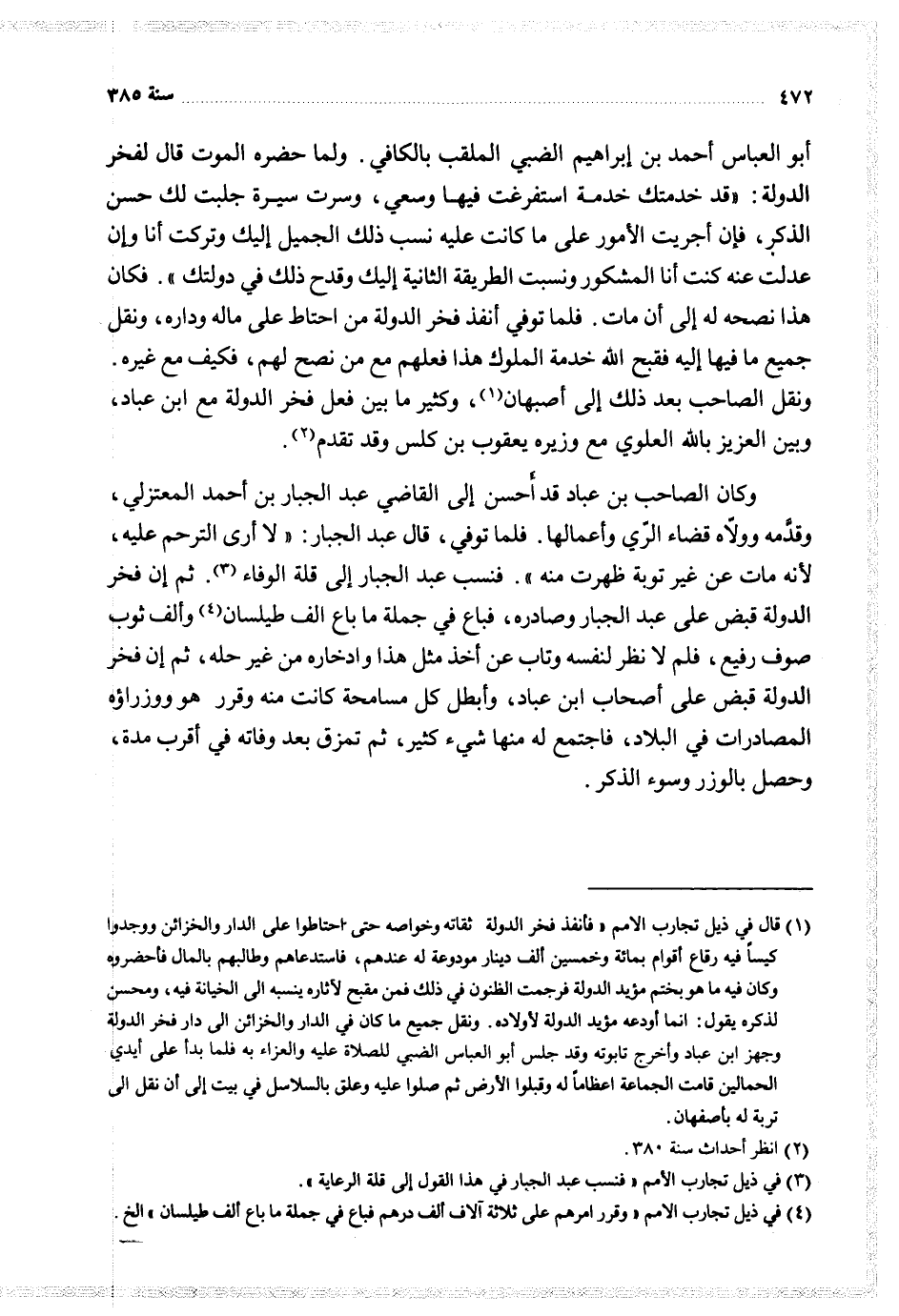 أبو العباس أحمد بن إبراهيم الضبي الملقب بالكافي ولما حضره الموت قال لفخر الدولة قد خدمتك خدمة استفرغت فيها وسعي وسرت سيرة جلبت لك حسن الذكر فأن أجريت الأمور على ما كانت عليه نسب ذلك الجميل إليك وتركت أنا وإن عدلت عنه كنت أنا المشكور ونسبت الطريقة الثانية إليك وقدح ذلك في دولتك فكان هذا نصحه له إلى أن مات فلما توفي أنفذ فخر الدولة من احتاط على ماله وداره ونقل جميع ما فيها إليه فقبح الله خدمة الملوك هذا فعلهم مع من نصح لهم فكيف مع غيره ونقل الصاحب بعد ذلك إلى أصبهان وكثير ما بين فعل فخر الدولة مع ابن عباد وبين العزيز بالله العلوي مع وزيره يعقوب بن كلس وقد تقدم