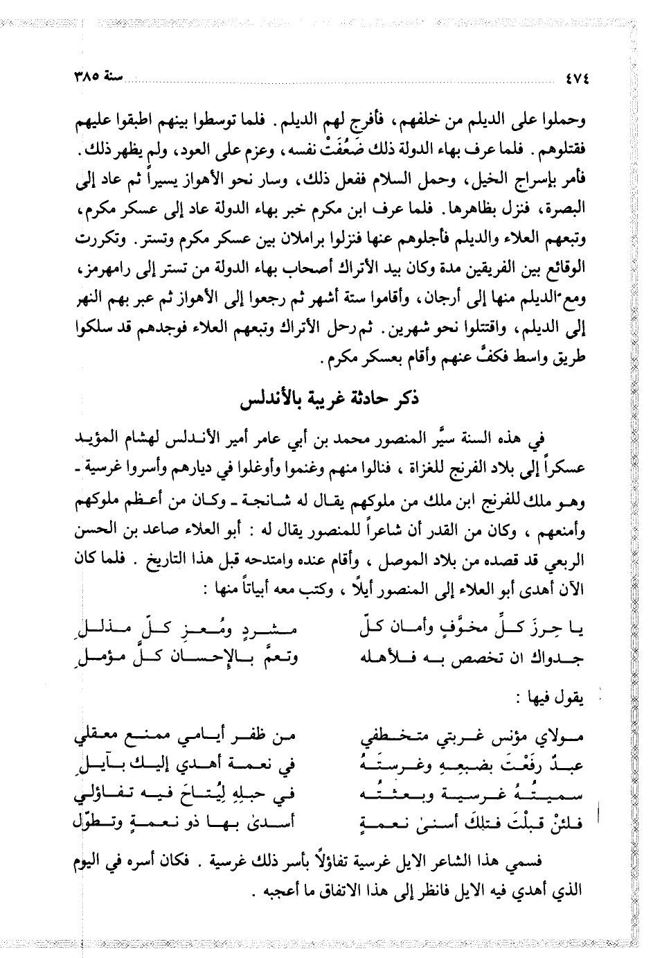 في هذه السنة سير المنصور محمد بن أبي عامر أمير الأندلس لهشام المؤيد عسكرا إلى بلاد الفرنج للغزاة فنالوا منهم وغنموا وأوغلوا في ديارهم وأسروا غرسية وهو ملك للفرنج ابن ملك من ملوكهم يقال له شانجة وكان من أعظم ملوكهم وأمنعهم وكان من القدر أن شاعرا للمنصور يقال له أبو العلاء صاعد بن الحسن الربعي قد قصده من بلاد الموصل وأقام عنده وامتدحه قبل هذا التاريخ فلما كان الآن أهدى أبو العلاء إلى المنصور أيلا وكتب معه أبياتا منها