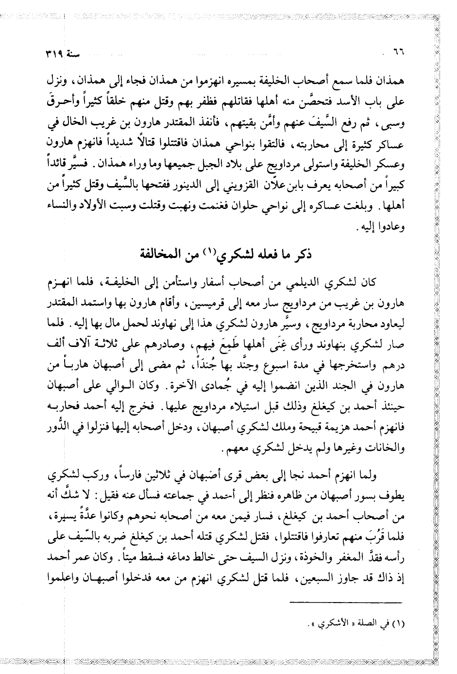 همذان فلما سمعع أصحاب الخليفة بمسيره انهزموا من همذان فجاء همذان ونزل على باب الأسد فتحصن منه أهلها فقاتلهم فظفر منهم خلقا كثيرا وأحرق وسبى ثم رفع السيف عنهم وأمن بقيتهم فأنفذ المقتدر هارون بن غريب الخال في عساكر كثيرة إلى محاربته فالتقوا بنواحي همذان فاقتتلوا قتالا شديدا فانهزم هارون وعسكر الخليفة واستولى مرداويج على بلاد الجبل جميعها وما وراء همذان فسير قائدا كبيرا من أصحابه يعرف بابن علان القزويني إلى الدينور ففتحها بالسيف وقتل كثيرا من أهلها وبلغت عساكره إلى نواحي حلوان فغنمت ونهبت وقتلت وسبت الأولاد والنساء وعادوا إليه