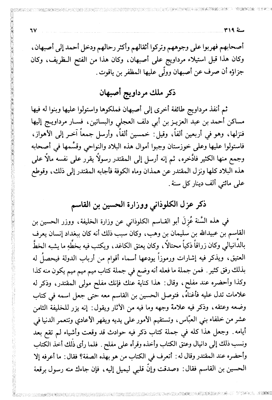 في هذه السنة عزل أبو القاسم الكلوذاني عن وزارة الخليفة ووزر الحسين بن القاسم بن عبيد الله بن سليمان بن وهب وكان سبب ذلك أنه كان ببغداد إنسان يعرف بالدانيالي وكان زراقا ذكيا محتالا وكان يعتق الكاغد ويكتب فيه بخطه ما يشبه الخط العتيق ويذكر فيه إشارات ورموزا يودعها أسماء أقوام من أرباب الدولة فيحصل له بذلك رفق كثير فمن جملة ما فعله أنه وضع في جملة كتاب ميم ميم ميم يكون منه كذا وكذا وأحضره عند مفلح وقال هذا كناية عنك فإنك مفلح مولى المقتدر وذكر له علامات تدل عليه فأغناه فتوصل الحسين بن القاسم معه حتى جعل اسمه في كتاب وضعه وعتقه وذكر فيه علامة وجهه وما فيه من الآثار ويقول إنه يزر للخليفة الثامن عشر من خلفاء بني العباس وتستقيم الأمور على يديه ويقهر الأعادي وتتعمر الدنيا في أيامه وجعل هذا كله في جملة كتاب ذكر فيه حوادث قد وقعت وأشياء لم تقع بعد ونسب ذلك إلى دانيال وعتق الكتاب وأخذه وقرأه على مفلح فلما رأى ذلك أخذ الكتاب وأحضره عند المقتدر وقال له أتعرف في الكتاب من هو بهذه الصفة فقال ما أعرفه إلا الحسين بن القاسم فقال صدقت وإن قلبي ليميل إليه فإن جاءك منه رسول برقعة