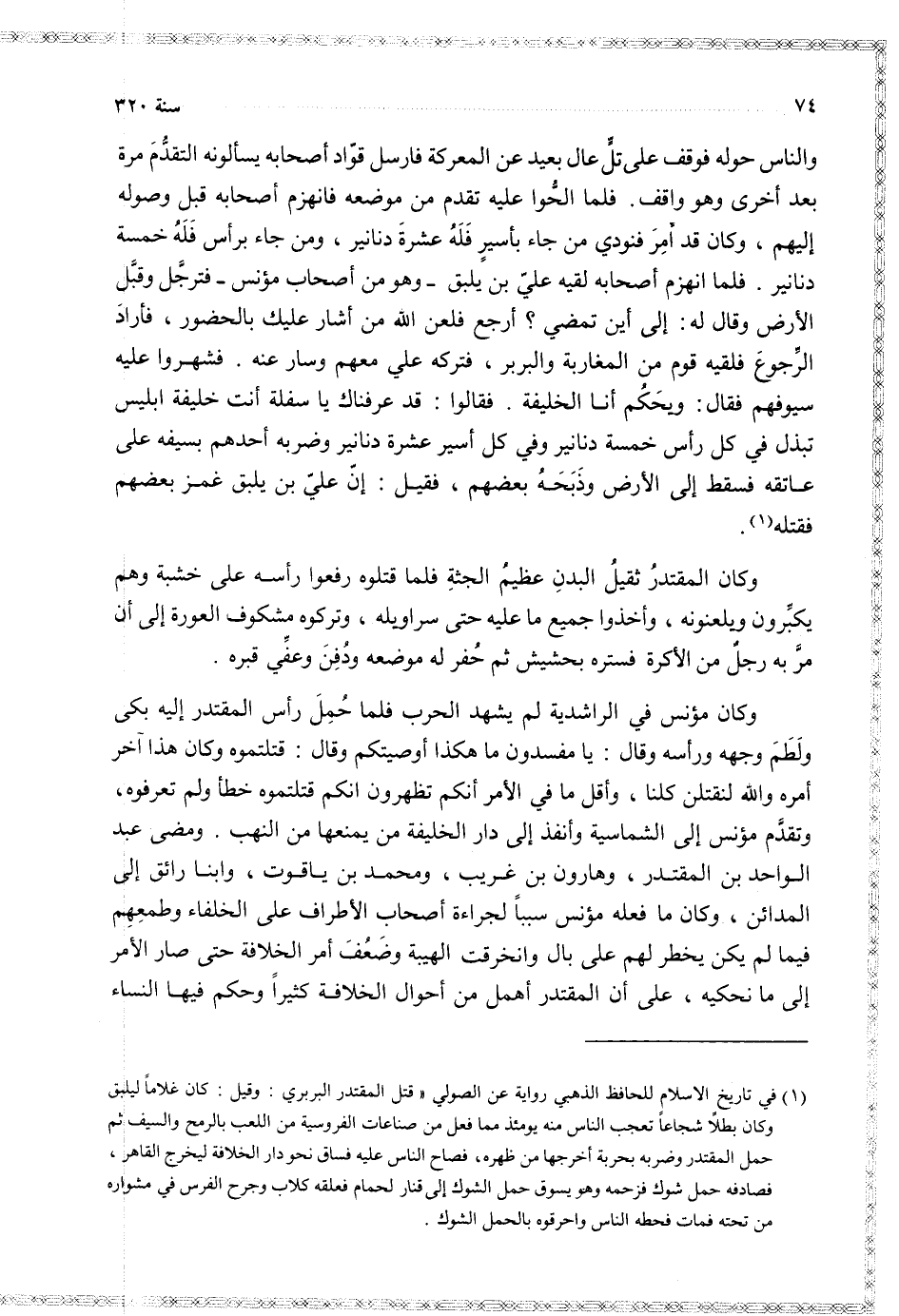 وكان المقتدر ثقيل البدن عظيم الجثة فلما قتلوه رفعوا رأسه على خشبة وهم يكبرون ويلعنونه وأخذوا جميع ما عليه حتى سروايله وتركوه مشكوف العورة إلى أن مر به رجل من الأكرة فستره بحشيش ثم حفر له موضعه ودفن وعفي قبره